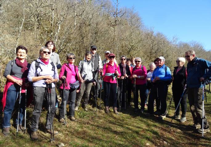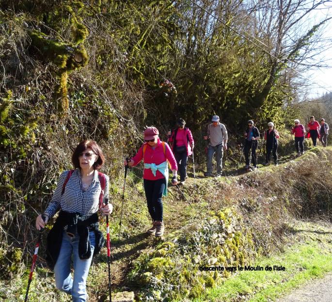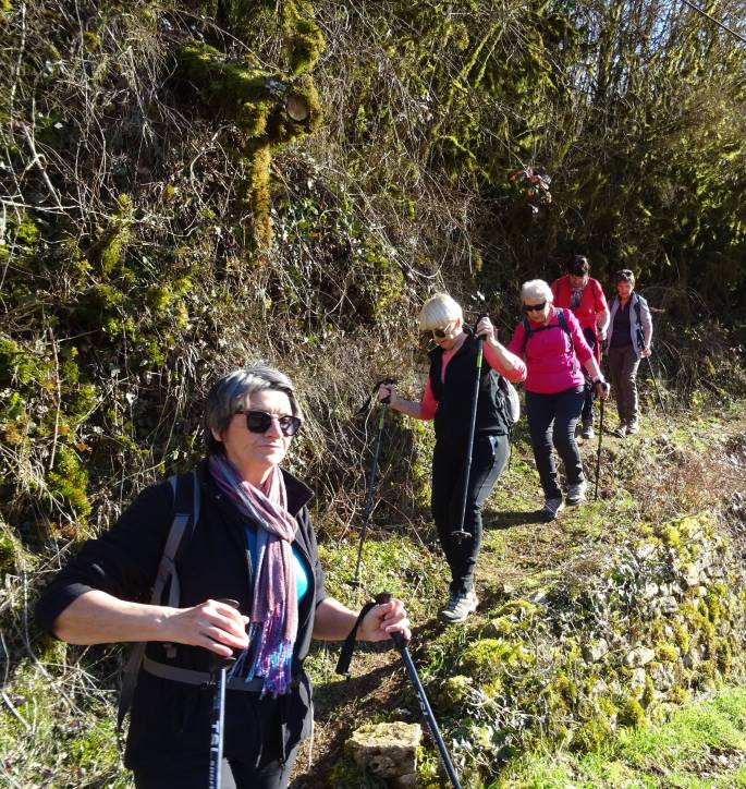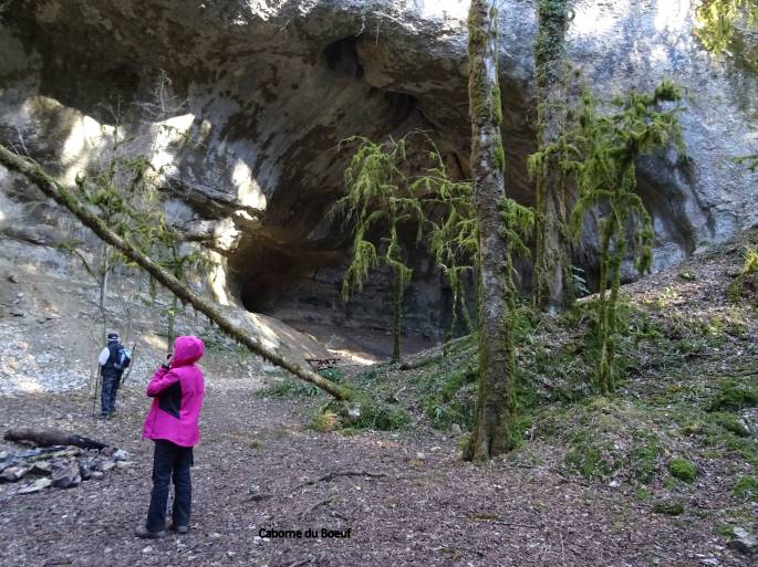 C’est toujours avec un soleil resplendissant et brûlant pour un 26 février que nous avons randonné en Petite montagne dans les gorges de La Valouse.18 marcheurs (4 hommes) ont commencé par une brève visite de l’église romane de St Hymetière, une des plus belles églises de Franche- Comté bâtie au Xième siècle, couverte en pierres et décorée d’arcatures lombardes. Après une longue descente très douce, nous découvrons le Moulin de L’Isle au bord de La Valouse et plus loin, un petit sentier bordé d’arbres couverts de mousse qui nous amène à La Caborne du Bœuf, site magique ! C’est une grotte qui s’ouvre par un porche aux dimensions impressionnantes, le plus grand porche de grotte du Jura. Cette Caborne est un mystère spéléologique, connue depuis longtemps. Les voyageurs s’y arrêtaient déjà au XIXème siècle. Après une petite pause dans ce lieu fascinant et merveilleux, il faut, par un petit sentier se faufilant entre les falaises, remonter aux voitures tout en admirant quelques cascades. Avant l’arrivée, nous pouvons admirer la majestueuse église isolée du village au milieu des champs où paissent des bovins.