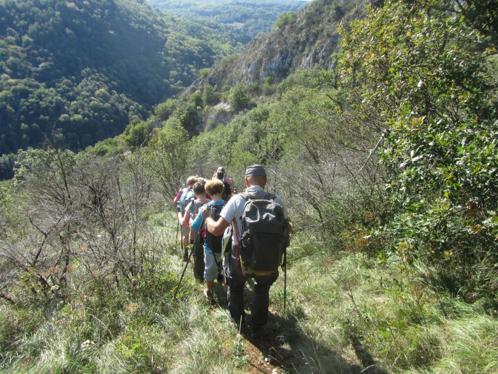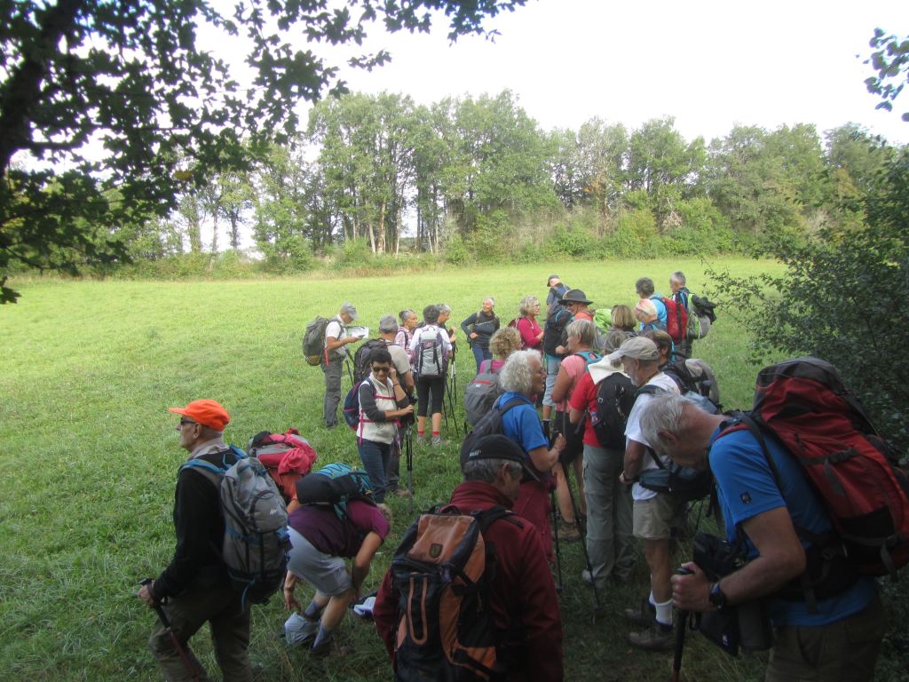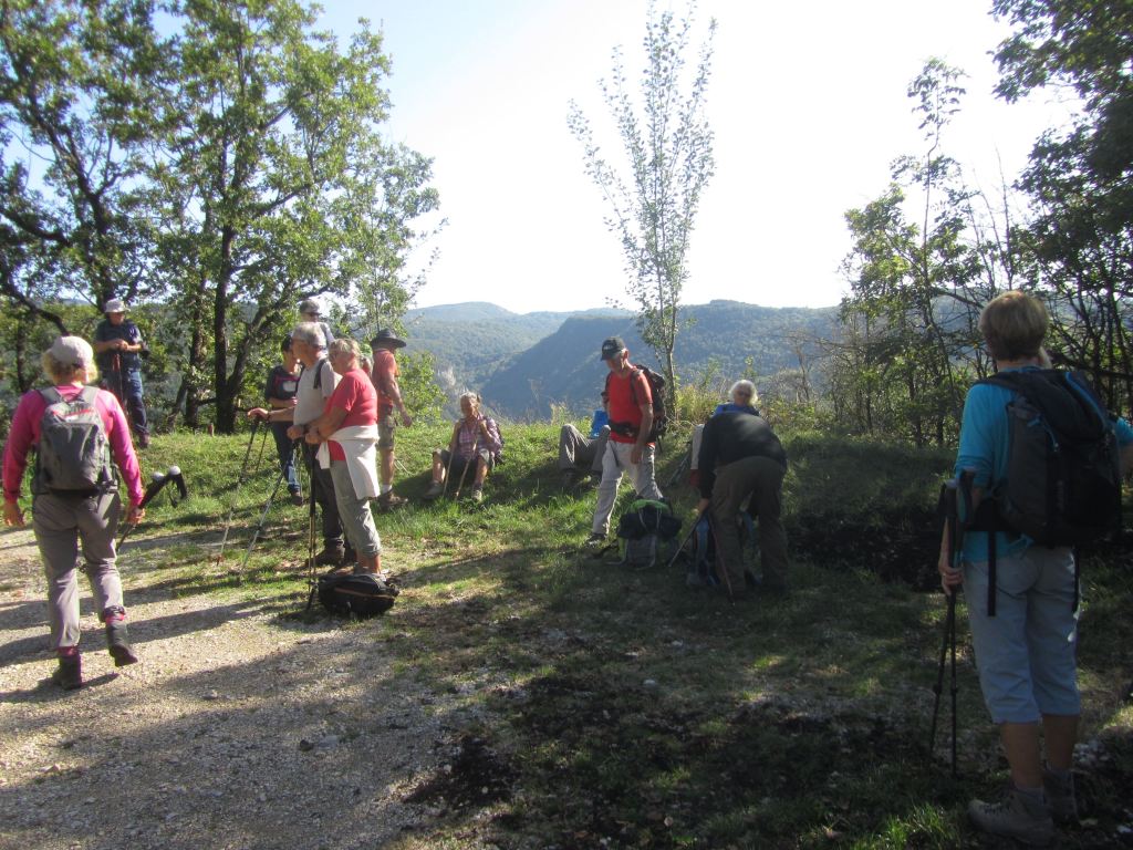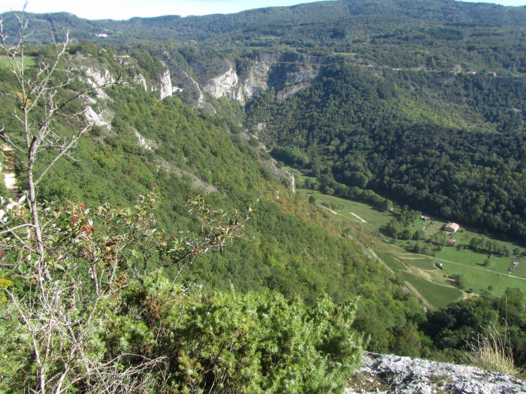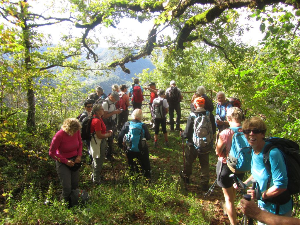 Première montée pour atteindre le panoramique ; puis Labalme où nous croisons un magnifique troupeau de race Aubrac ; quelques hésitations pour trouver le sentier qui mène au « château Vieux » et son belvédère ( qui mériterait d’être dégagé!)… Après la traversée de la route du Vieux Cerdon, une belle grimpette nous mène sur le sentier des crêtes, le Rocher de St Alban et sa chapelle en rénovation… nouveau point de vue sur la vallée ! Nous profitons grandement de la pause, avant de reprendre le sentier des crêtes sud. Nous plongeons sur un étroit sentier parfois glissant et rejoignons la vallée. Nous terminons en remontant le ruisseau « Le Veyron ».