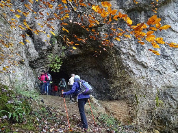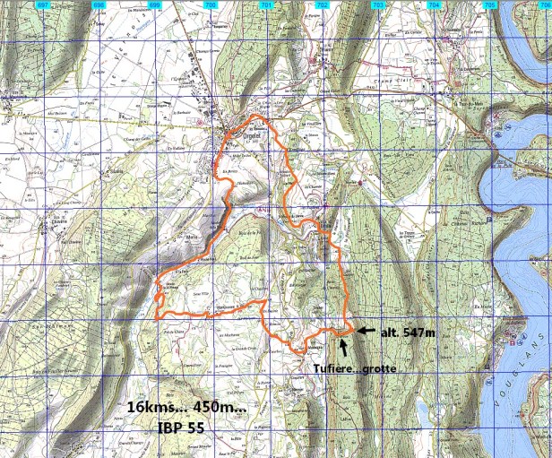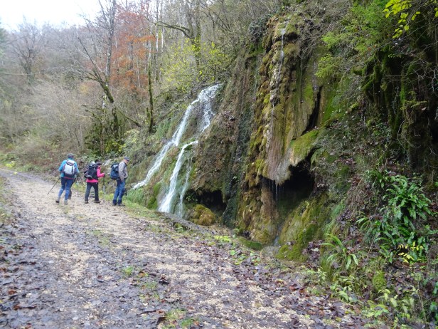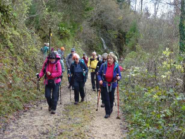 Traversée du village, aux maisons magnifiquement retapées. Une piste carrossable nous amène à la cascade de La Tufière. Chose rare, beaucoup d’eau ! Tout proche, un sentier assez raide, recouvert de feuilles nous emmène à une grotte qui, en période de guerre fut utilisée comme « un habitat de fortune » où se sont réfugiées des familles d’Orgelet. Aujourd’hui, elle abrite des Chauves- souris. En redescendant, vue panoramique sur St Christophe, Orgelet. Une bonne grimpette et nous traversons un pâturage face à la bourgade d’Orgelet puis nous nous enfonçons dans la forêt habitée de buis tout secs, d’épicéas, de hêtres, d’ormes avant de descendre pour arriver aux marais. Ecrille; encore un village coquet où coule la rivière Le Merlue que nous traversons. Un joli chemin de chemin de crête avec de belles vue sur le bourg d’Orgelet et ses environs nous ramène aux voitures.