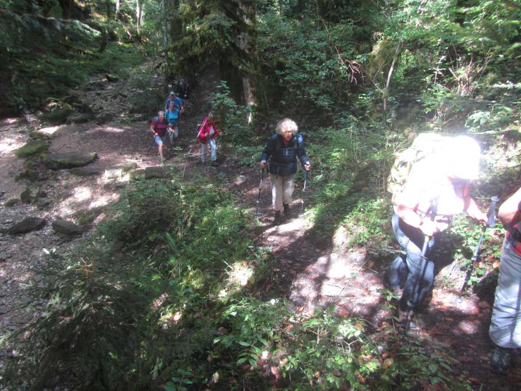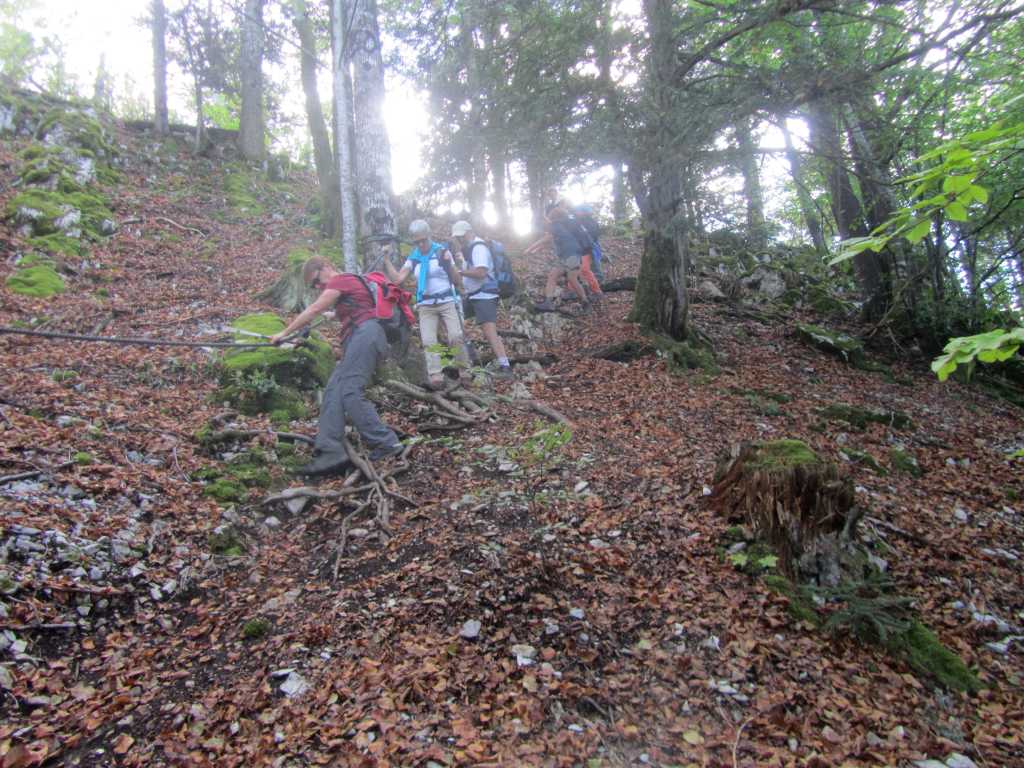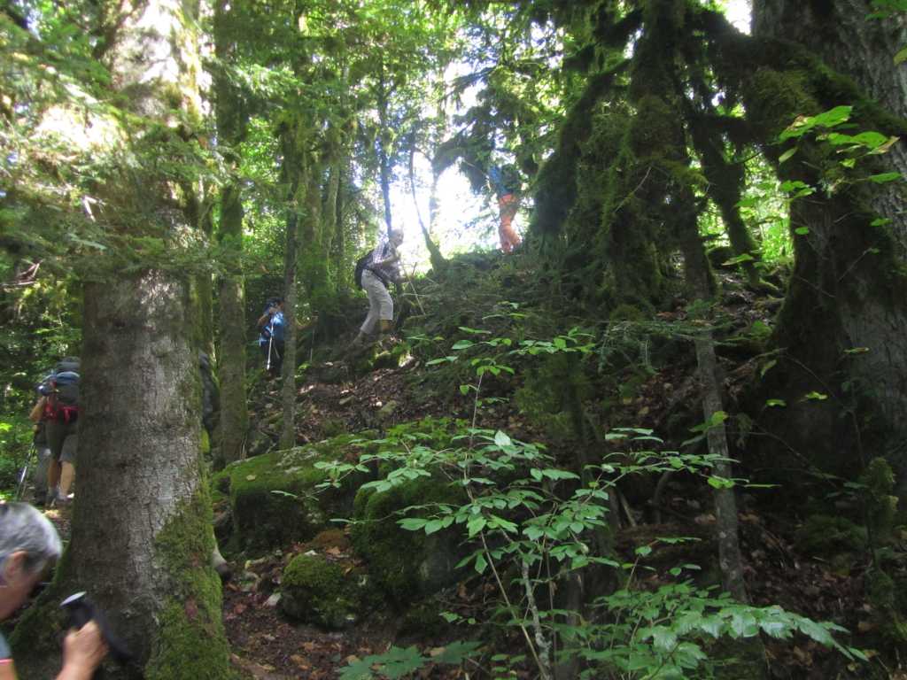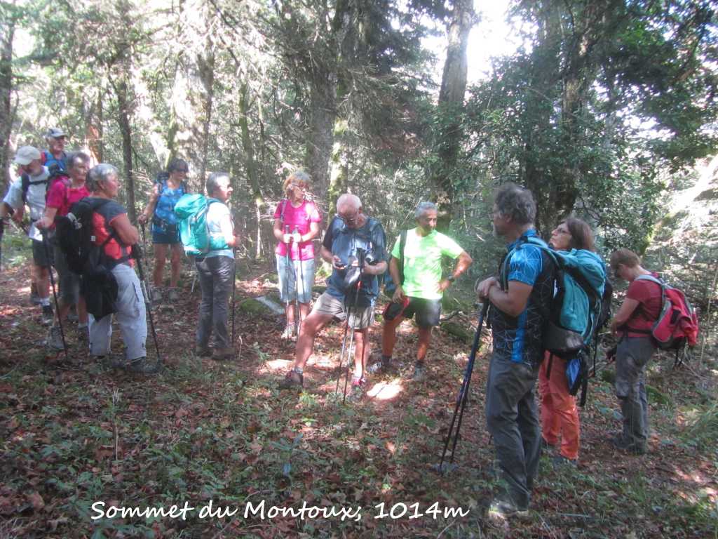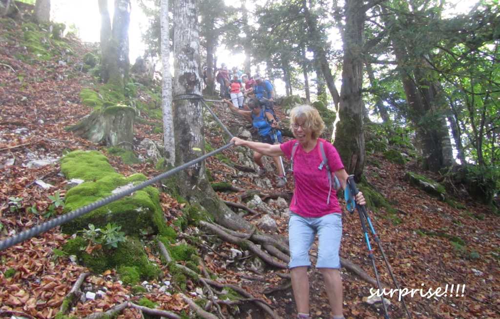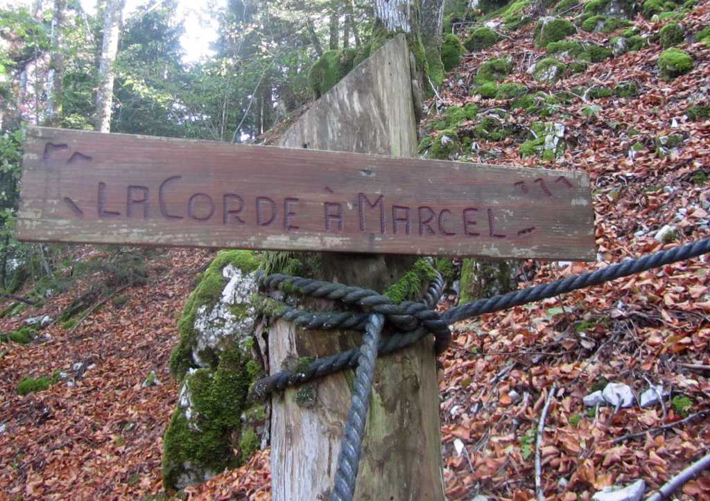 Retour à la Chartreuse pour la pause et le groupe de l’après midi nous rejoint. 30 personnes partent pour la seconde boucle… de bons chemins et pas de souci de recherche d’itinéraire .. La Gouille, Champ de Joux, Brénod, La Scie et, en face de nous se profile « Le Montoux »… Au choix des participants… on contourne ou on grimpe? les randonneurs se séparent; nous attaquons la grimpée et 140m plus haut , nous atteignons le sommet à 1014m. Après la montée, forcément une descente ! et une surprise ! 140 m de désescalade raide, en partie sur « la corde à Marcel » . je rate le bon sentier, sans doute moins raide pour , enfin , arriver en bas.
