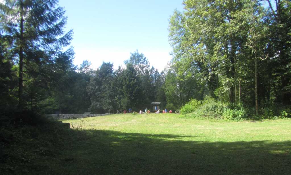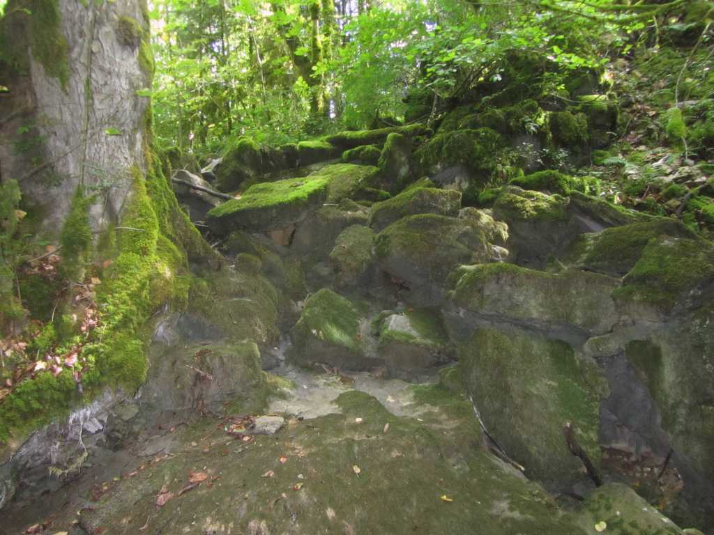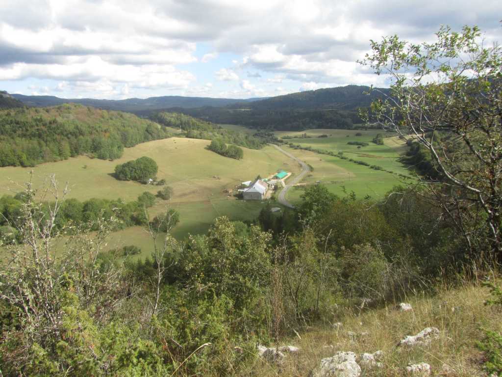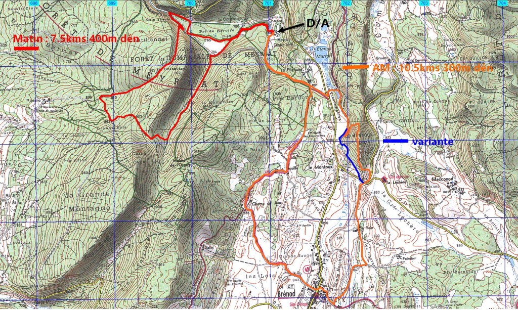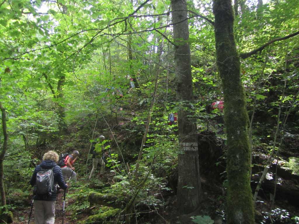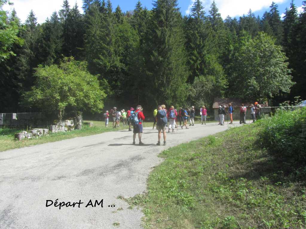 Retour à la Chartreuse pour la pause et le groupe de l’après midi nous rejoint. 30 personnes partent pour la seconde boucle… de bons chemins et pas de souci de recherche d’itinéraire .. La Gouille, Champ de Joux, Brénod, La Scie et, en face de nous se profile « Le Montoux »… Au choix des participants… on contourne ou on grimpe? les randonneurs se séparent; nous attaquons la grimpée et 140m plus haut , nous atteignons le sommet à 1014m. Après la montée, forcément une descente ! et une surprise ! 140 m de désescalade raide, en partie sur « la corde à Marcel » . je rate le bon sentier, sans doute moins raide pour , enfin , arriver en bas.