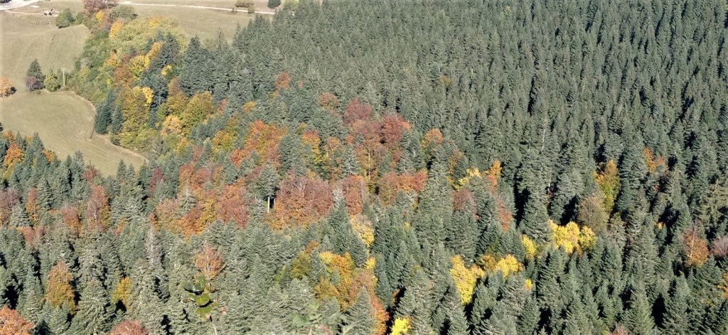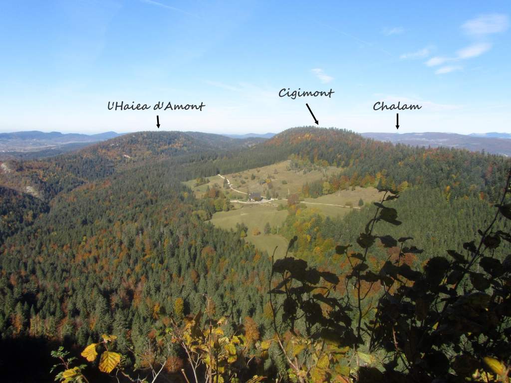 Nous avons emprunté un chemin de crête (l’Haiea d’Amont) jusqu’à la Croix de Cornillon et un belvédère avec une belle vue sur le plateau d’Hauteville.