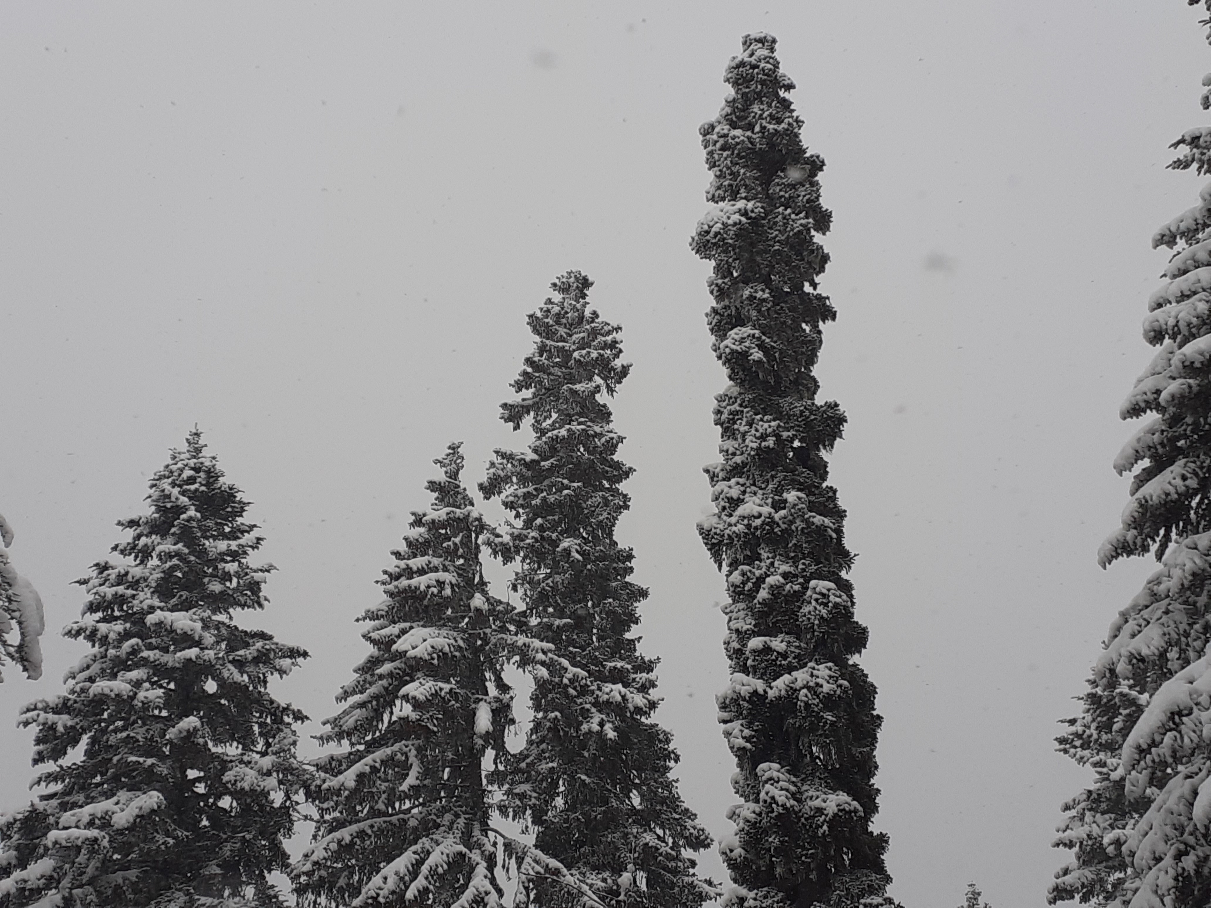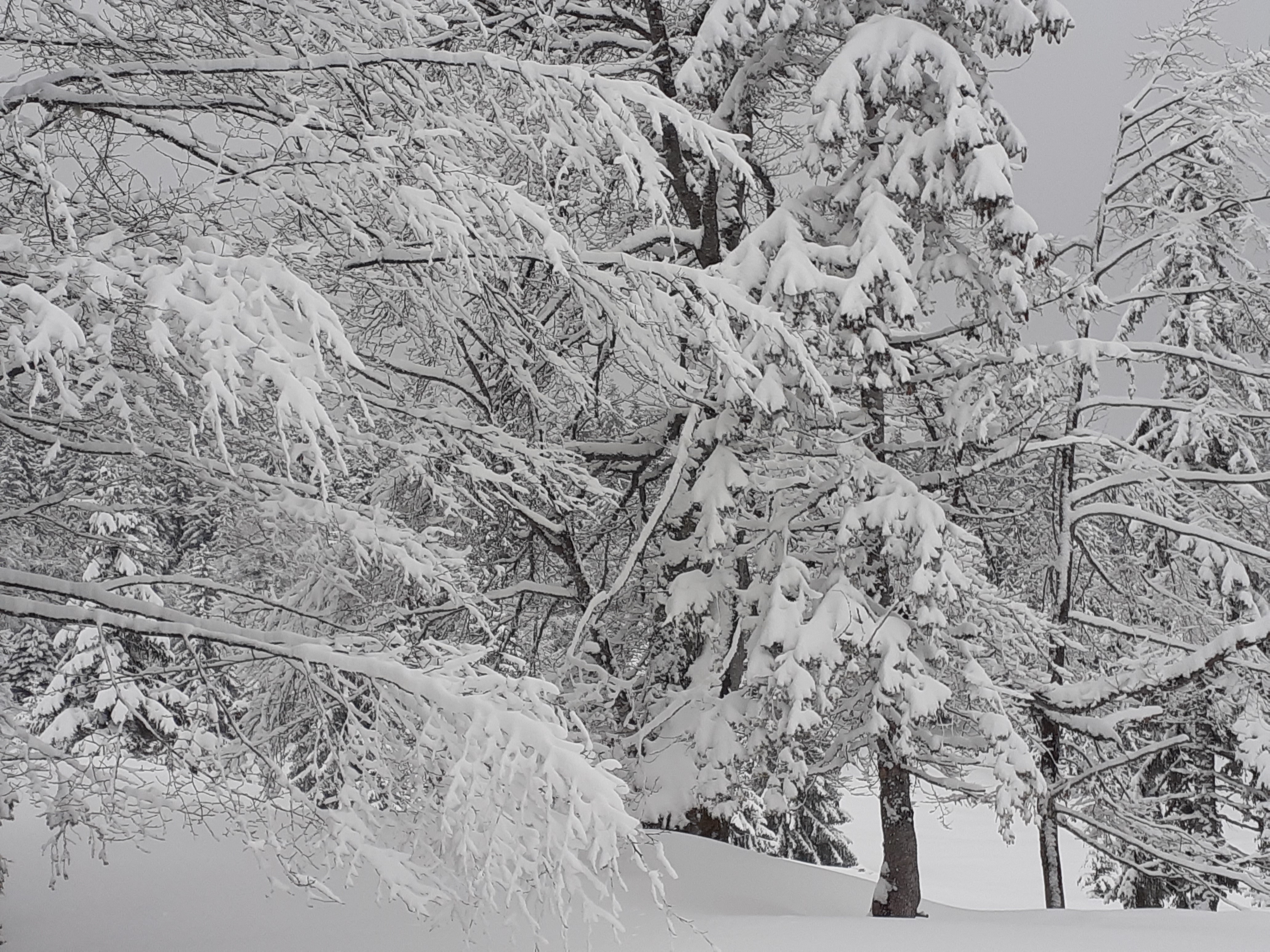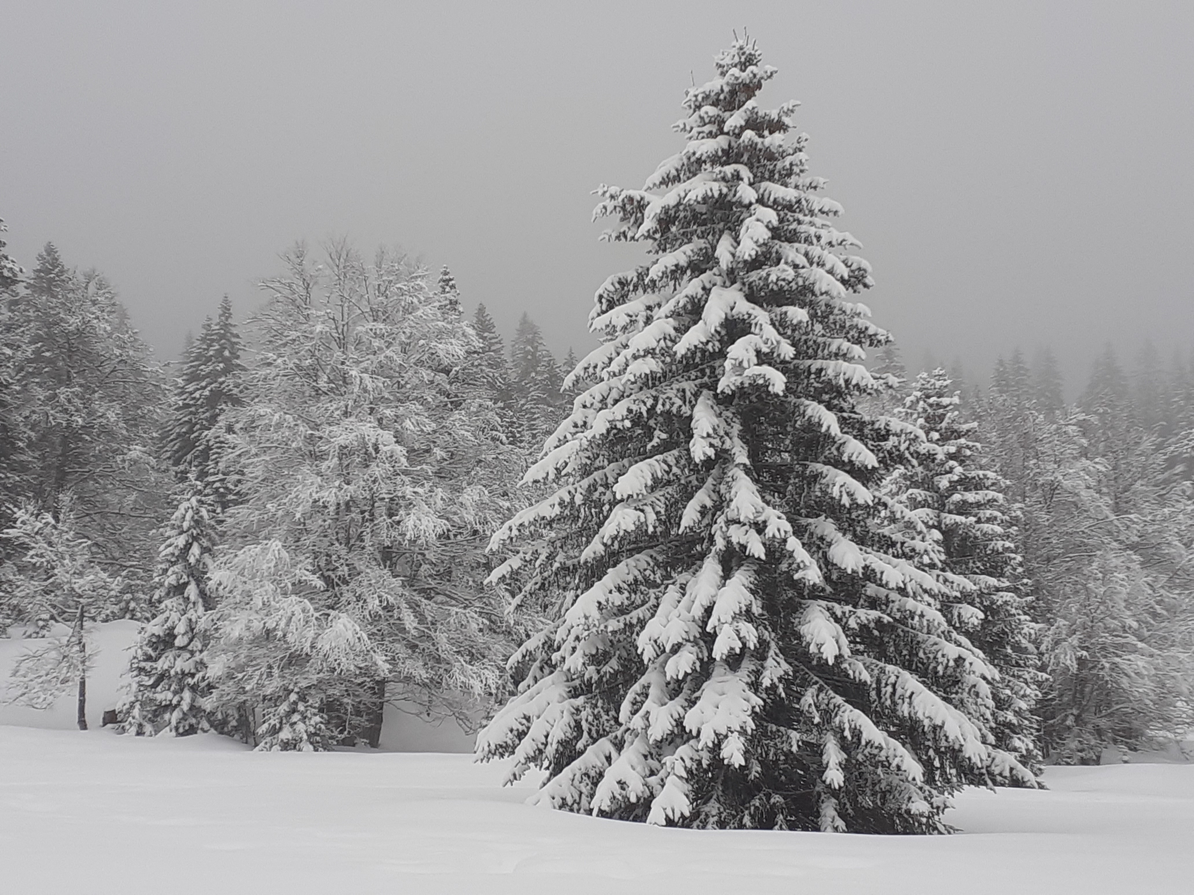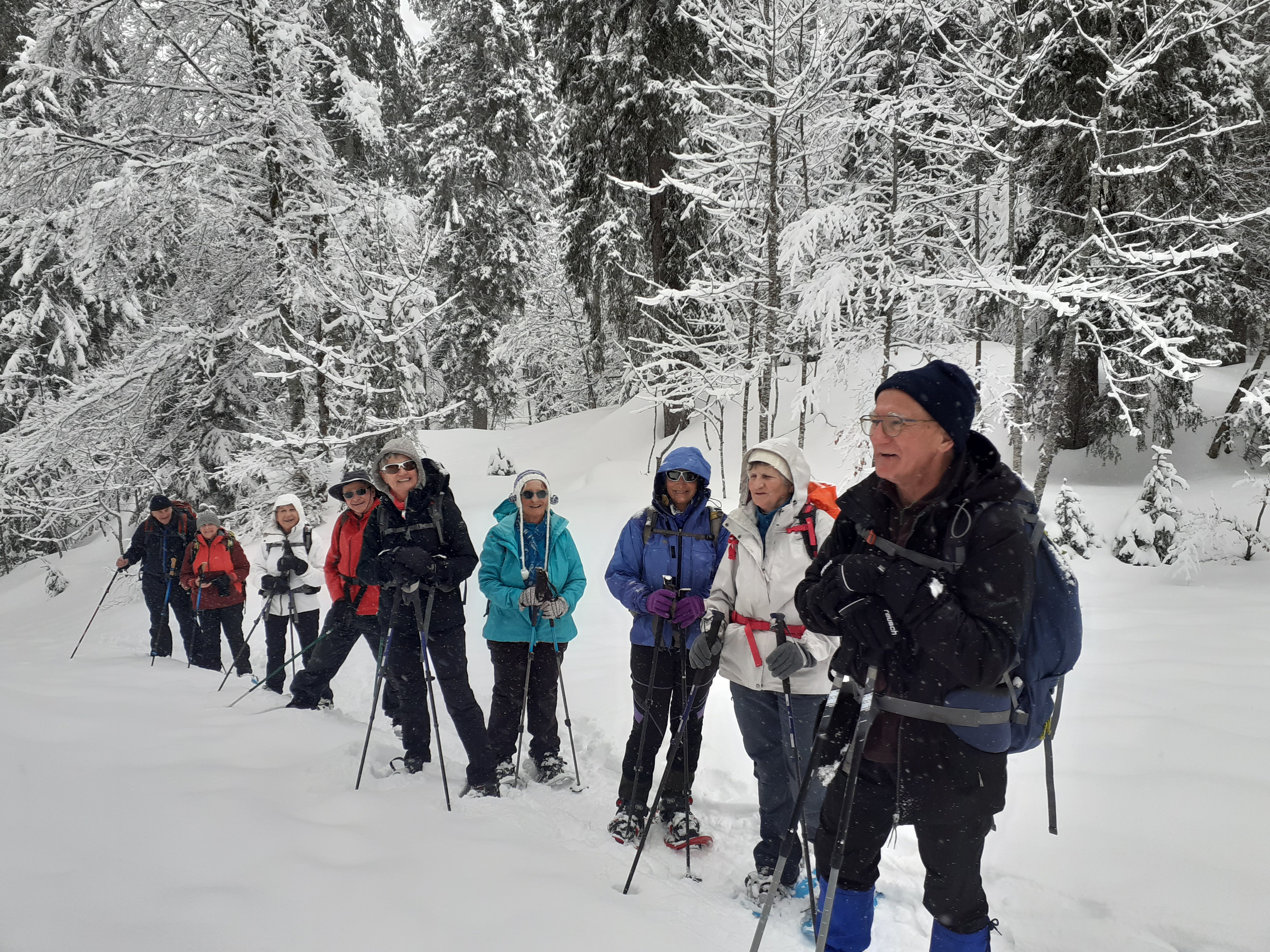 En effet, nous étions dix (3 hommes) à affronter une montée douce jusqu’au chalet de La Frasse avec quelques flocons .Puis une montée un peu plus raide nous conduisait à l’épicéa mûté , arbre étrange, une fantaisie de la nature. Mais là point de vue sur La Dole et le Mont Blanc.