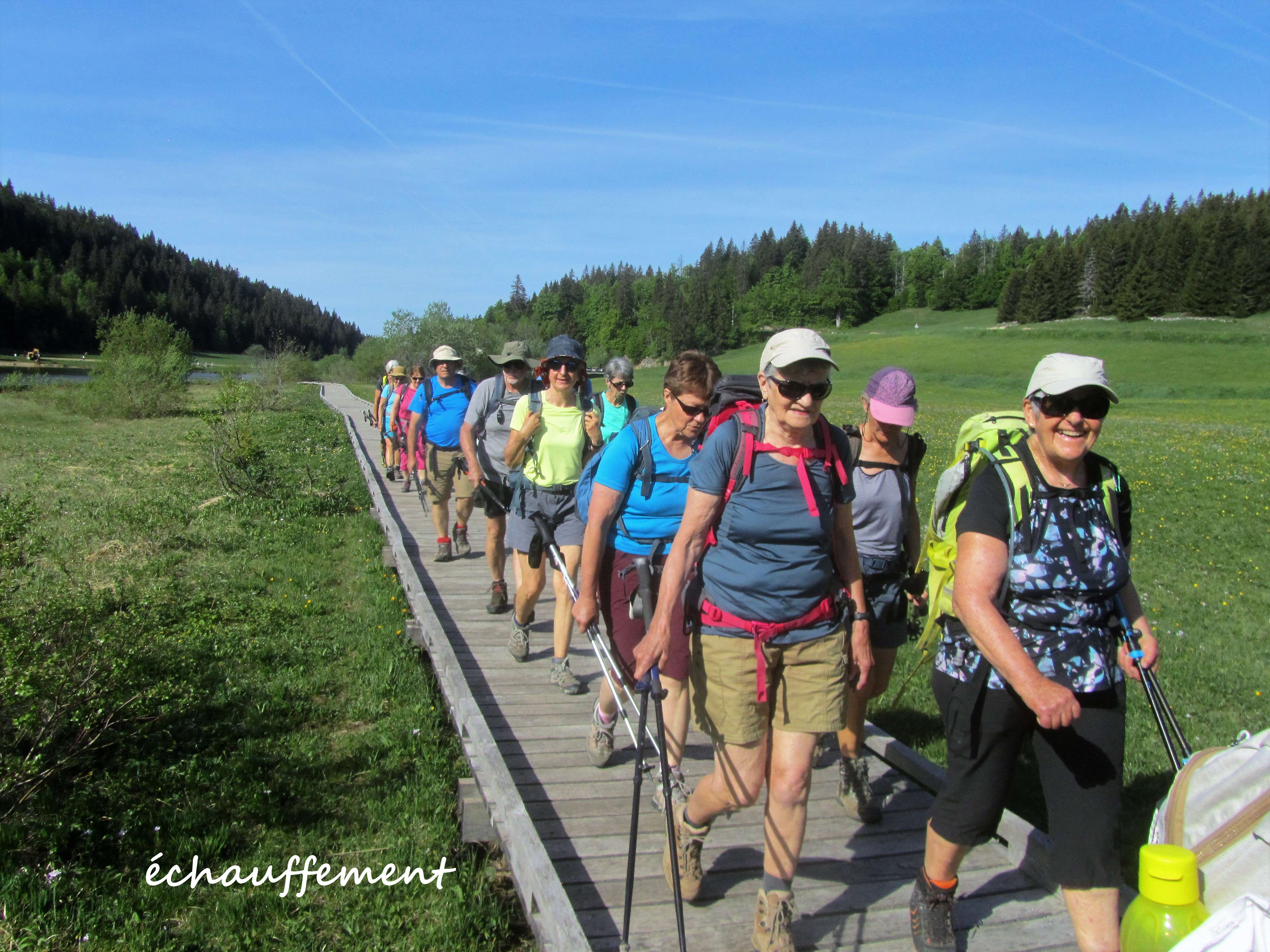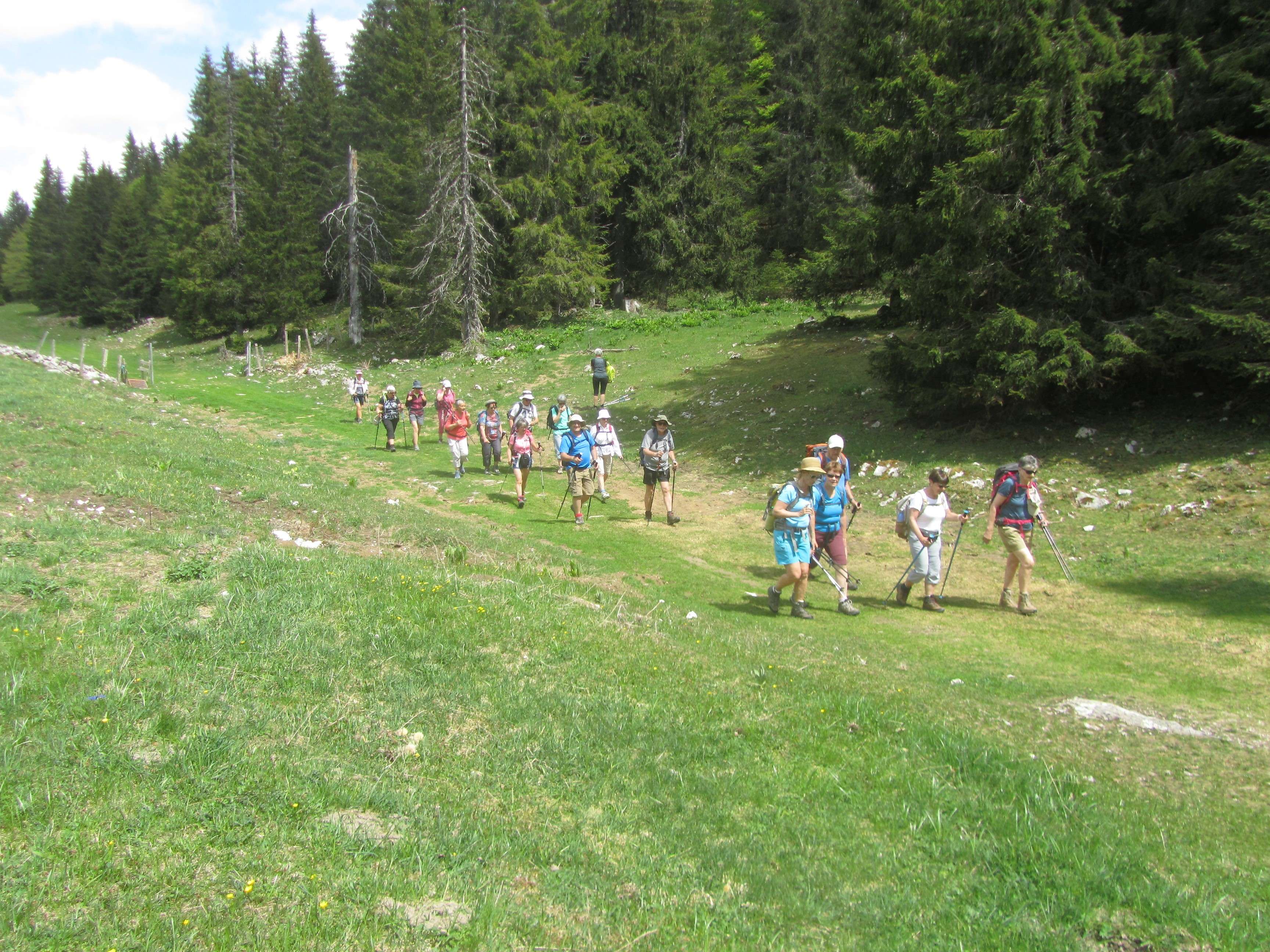 A 9h30, tout le monde est prêt pour un échauffement autour du lac…. pour aborder le premier raidillon et le premier belvédère. nous progressons sur une « combe suspendue », dépassons les Thoramys, le point de vue du lac (d’où il n’y a rien à voir), la « piscine artificielle. Un sentier nous mène au Crêt Pela.