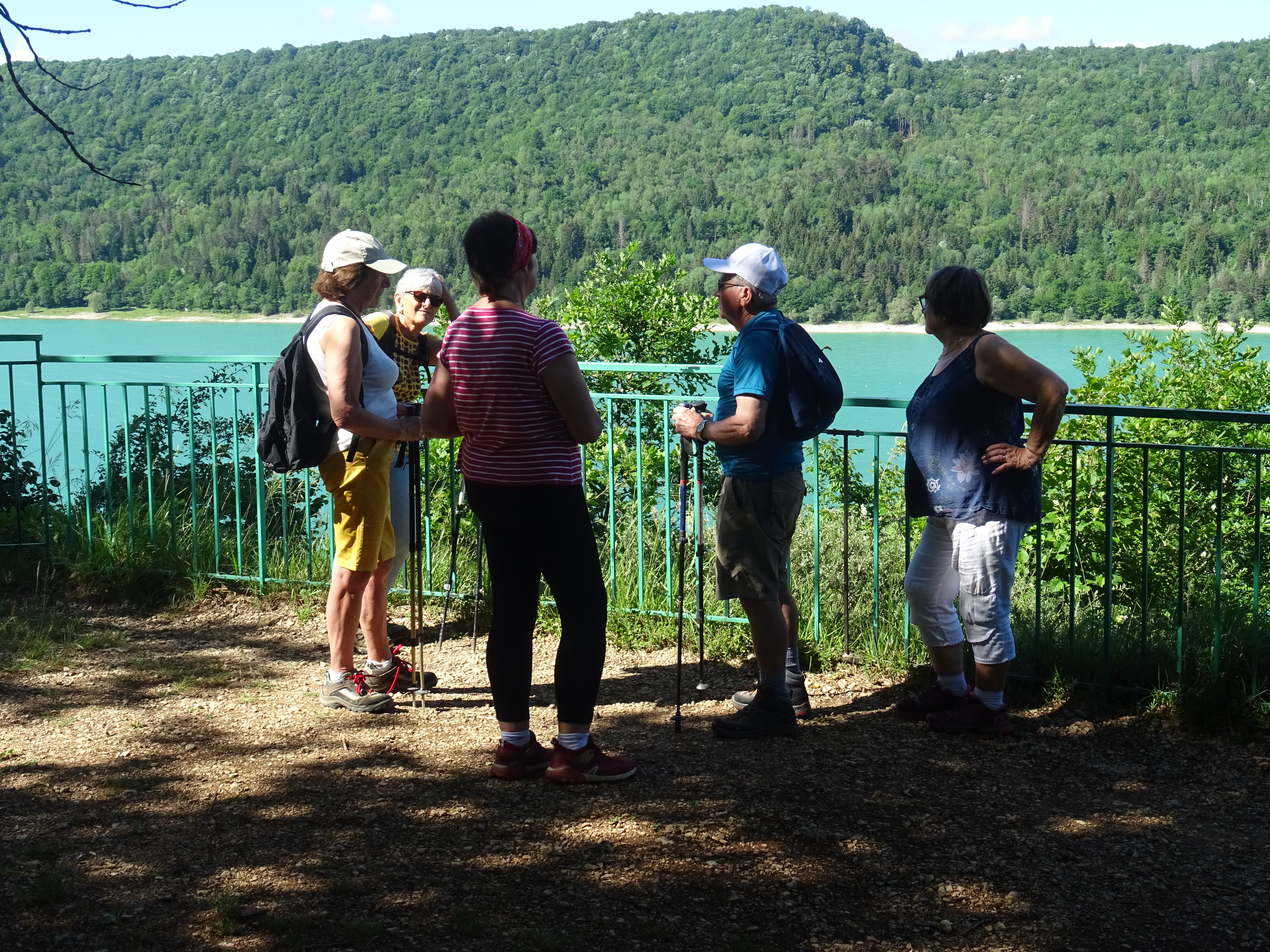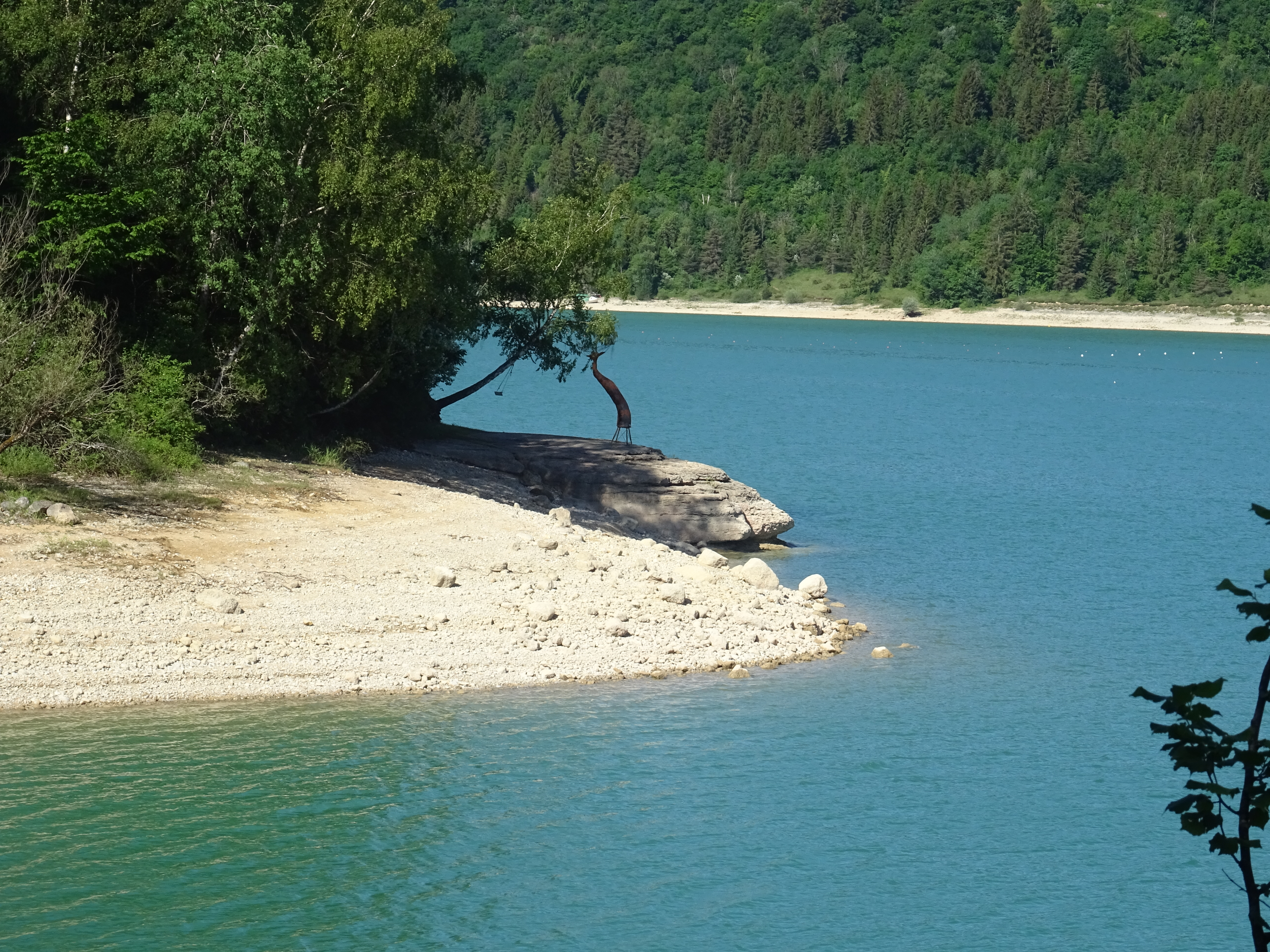 6 personnes dont 1 homme ont participé à la balade de la sirène égarée à partir du village de Maisod. Nous passons devant le château et chose rare le portail est ouvert! Belle vue sur le château qui a l’air admirablement entretenu. Le fils du jardinier est affairé à enlever de l’herbe contre le mur d’enceinte. Nous descendons en direction du Lac de Vouglans en suivant le parcours des crabes rouges. Nous faisons un aller-retour au bord de l’eau pour admirer la Sirène égarée (un des Contes IDECLIK).Du plat, quelques grimpettes, un bon chemin nous amènent au belvédère de La Frate où quatre gros crabes nous invitent à nous asseoir. Du belvédère, une vue époustouflante sur le lac avec de nombreux bateaux, la grande plage de Bellecin, la base nautique. Au loin, le village perché de St Christophe. L’eau est d’un bleu pur et quel calme! Nous repartons. Une montée assez raide pendant quelques minutes et plus douce ensuite : encore de belles vues sur ce lac merveilleux. La rando se termine par la lecture du conte et nous arrivons aux voitures Nous avons tous apprécié cette balade.
