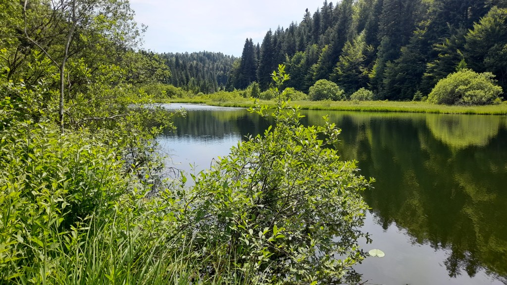 Bon après ça nous rebroussons chemin et prendre un sentier jusqu’au belvédère dit belvédère des lacs d’Etival , petite pose et nous descendons progressivement en forêt pour la route D308 à champs Gadout , 250 m après nous bifurquons à gauche pour longer le petit lac jusqu’au voitures.