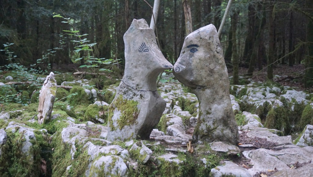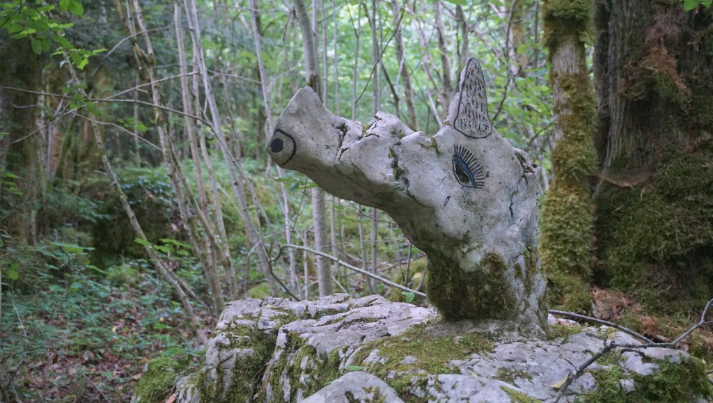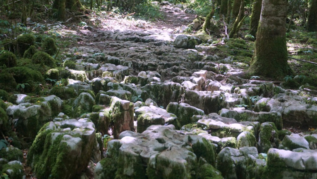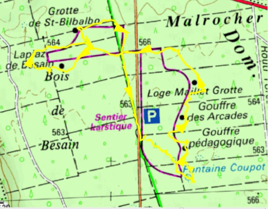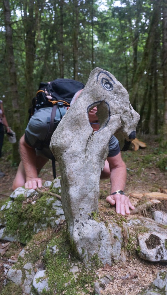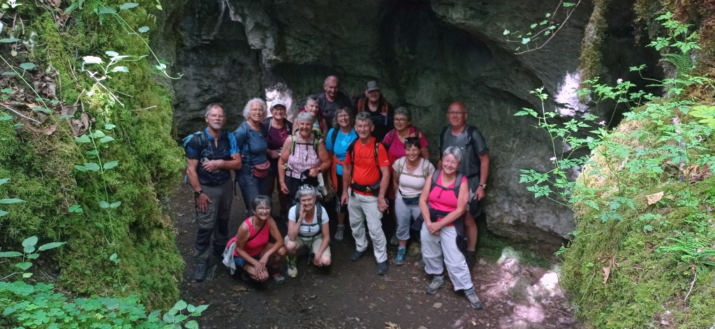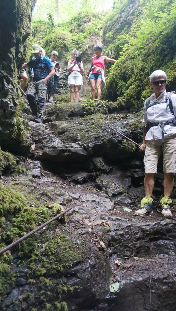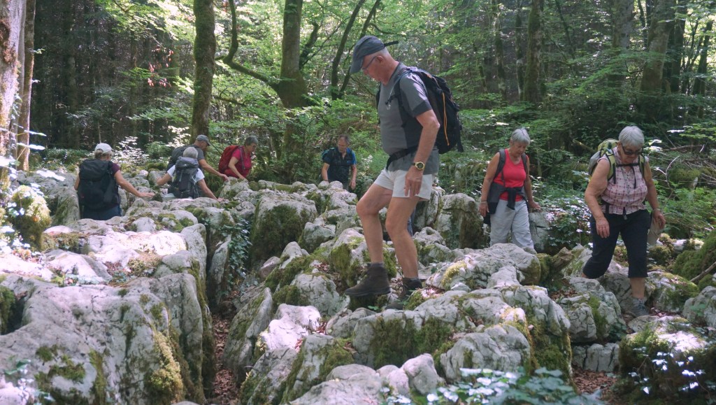 Nous étions 15 randonneurs (dont 5 hommes) qui arrivions au bout d’une route un peu longue (légèrement plus d’une heure), aventureuse (à cause d’une route barrée pour travaux qui passait bien finalement) et parfois pluvieuse au sentier karstique de Besain; on s’est bien amusés toute la matinée à descendre dans les nombreuses cavités et à s’étonner de ces curieux rochers…. pour parcourir 4 km et si peu de montée….
