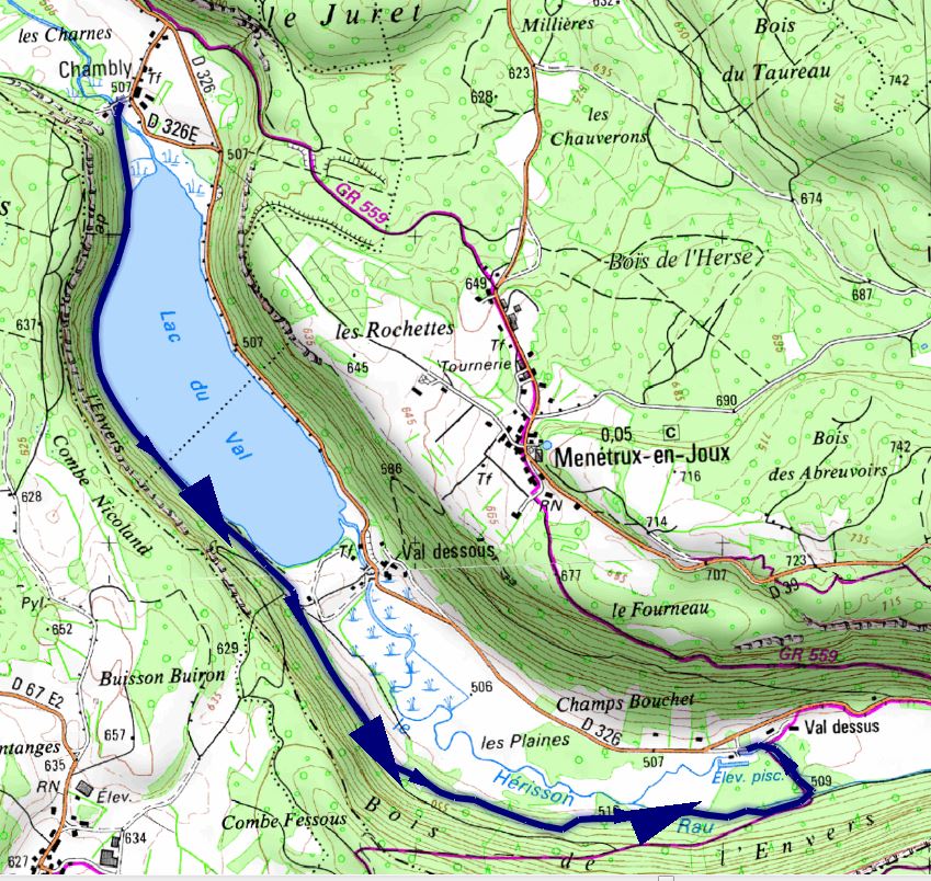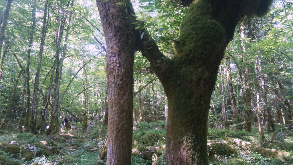 N’empêche qu’il faisait très chaud et qu’on était déjà bien affaiblis par la faim: la solution était de déjeuner sur place à l’ombre…. A la suite d’un choix peu démocratique, la décision est prise pour l’après midi de randonner le long du lac du Val dans la vallée du Hérisson qui se trouve sur la route du retour.