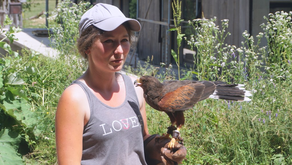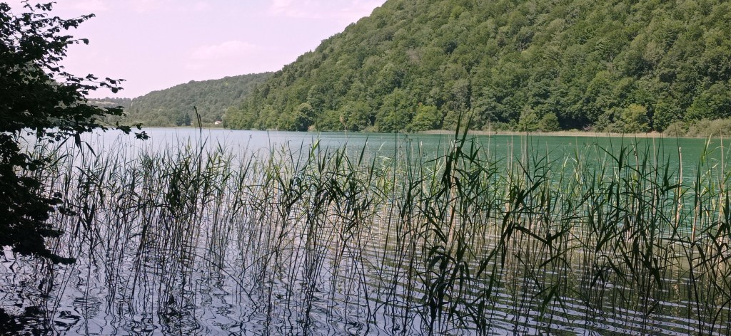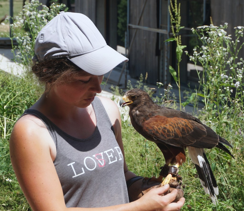 Après une petite manip de voitures qui permettait un aller sans retour, nous avons pu apprécier de marcher sur 4 km à l’ombre alors que la chaleur était peu supportable au soleil, de faire une belle rencontre insolite (la jeune fille à la buse au niveau du parc animalier) et d’admirer les eaux turquoises du lac du Val…