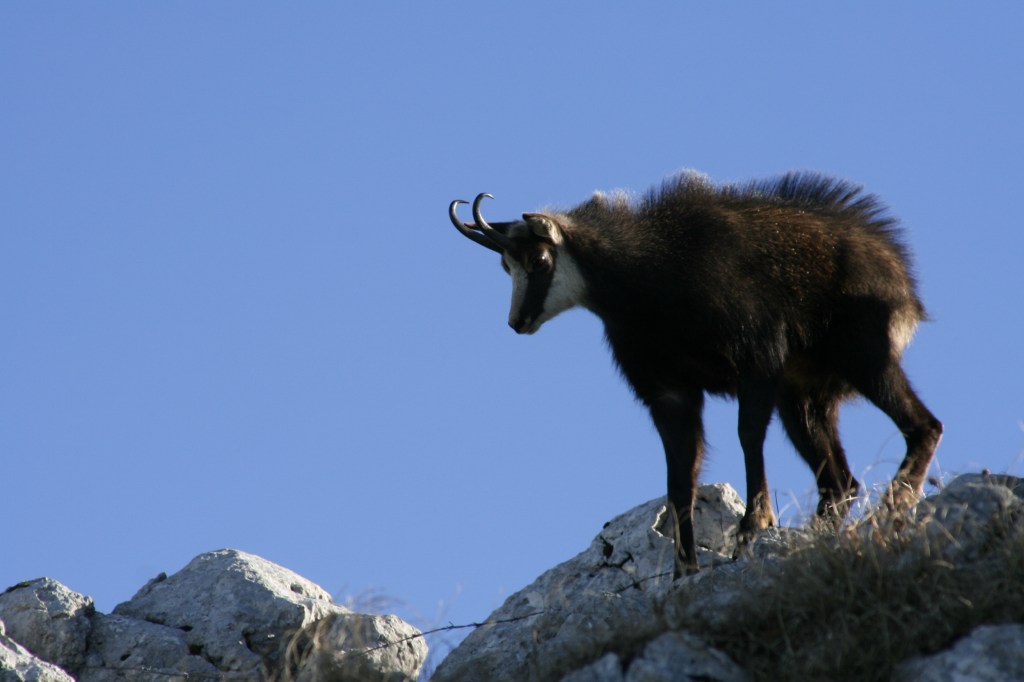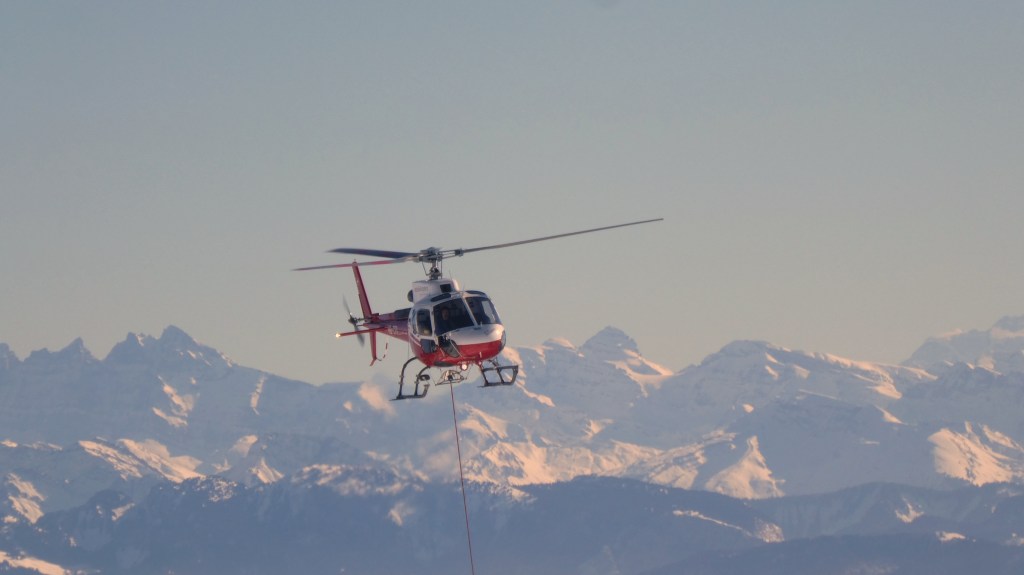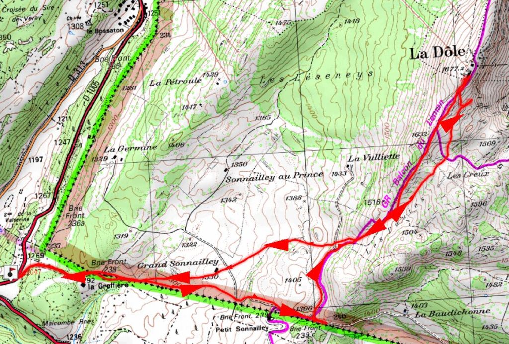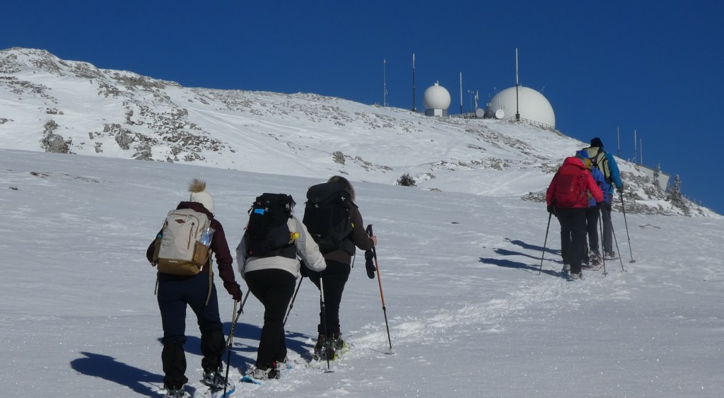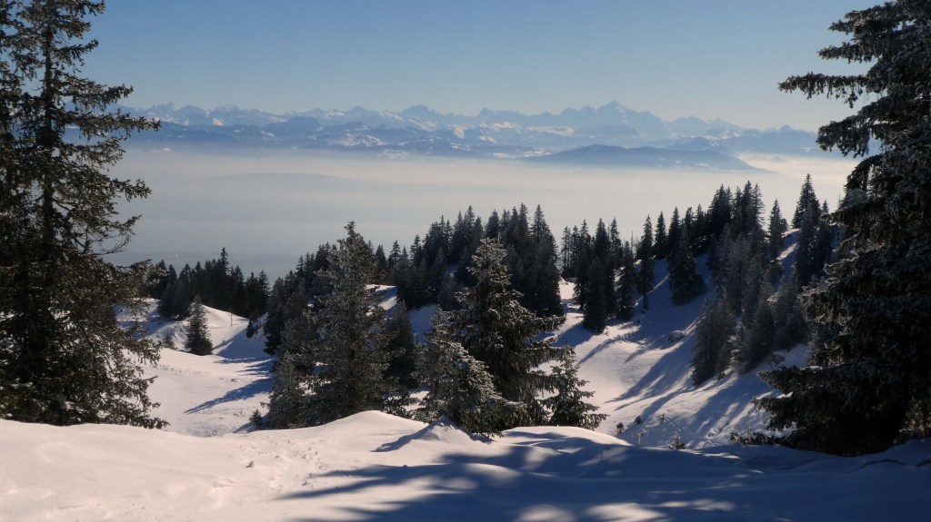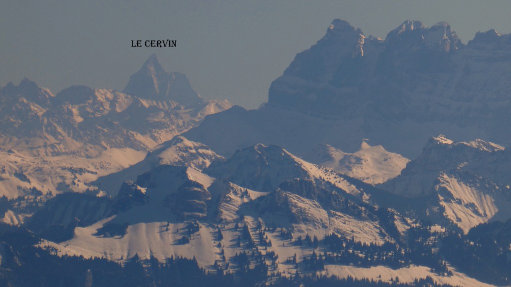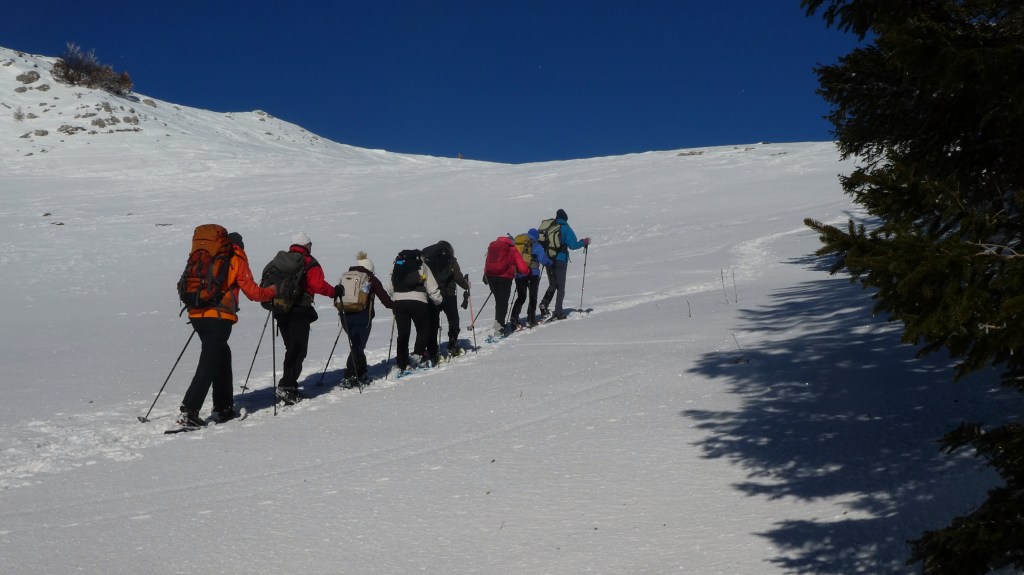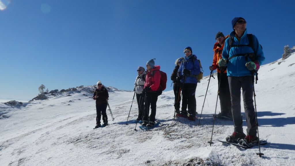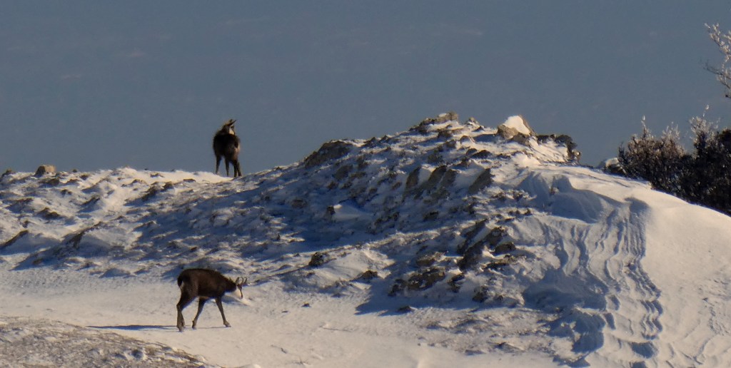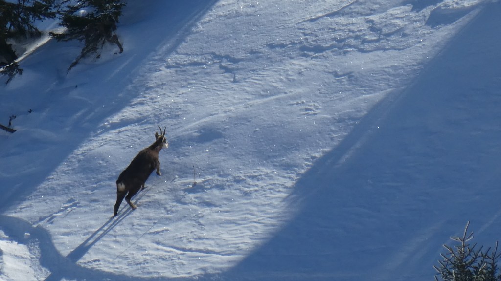 Voici une journée comme je les aime: un petit groupe de 9 randonneurs (5 femmes et 4 hommes) dynamique et sympathique, des vues panoramiques sur une grande partie de l’arc alpin, un sommet de la Dole sans vent où il fait bon déjeuner en contemplant le ballet d’un hélicoptère, une neige changeante mais pas désagréable à tracer, des chamois comme promis (j’en ai rajouté un de mauvais poil photographié au sommet de la Dole en 2008), une descente par l’arête variée et un peu aventureuse, un retour à 15h à la voiture après avoir parcouru 8 km et 460 m de montée…. Il fallait en profiter car la neige ne va pas durer s’il continue à faire aussi beau!