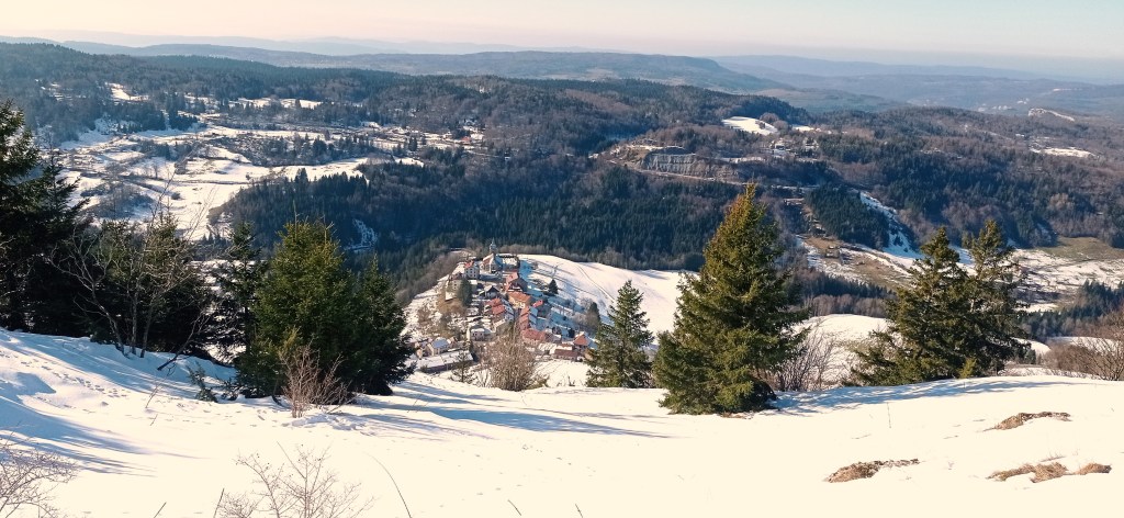 C’était un beau challenge que de parcourir sans raquettes ces étendues ensoleillées et enneigées par ce bel après midi de février et terminer à la croix des couloirs: nous étions 8 (6 femmes et 2 hommes) à apprécier ce beau petit tour d’à peine 4 km et contempler un panorama étendu sur notre région…