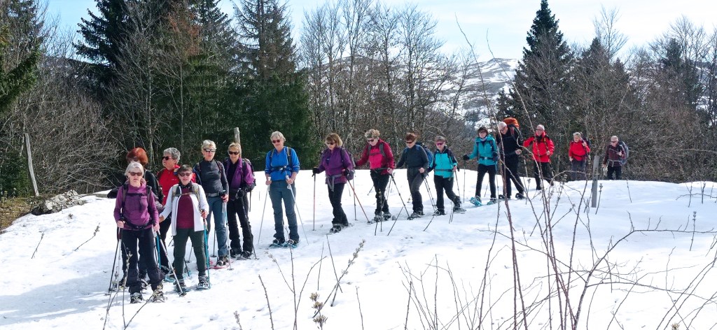 Encore une belle journée en raquettes avec un groupe énergique (13 randonneuses et 4 randonneurs) pour un probable adieu temporaire à cette activité; on a réussi à marcher sur la neige presque en permanence, mais il fallait vraiment chercher les passages qui devenaient assez techniques au milieu des arbustes et des branchages sournois …. Le beau temps était encore présent et la bonne humeur était toujours présente, même après 7 km de marche et 200 m de montée.