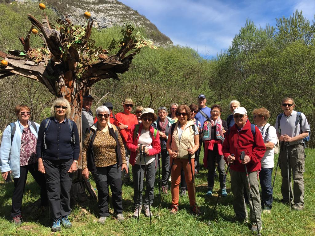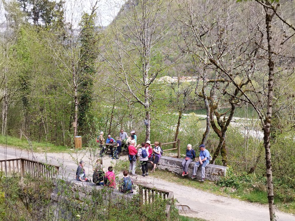 19 personnes dont 5 hommes ont choisi de marcher sur un parcours sympathique et méconnu par un certain nombre. Réunis à la recette du papet au bord de l’Héria, nous empruntons un sentier qui nous amène à l’arbre aux oranges ( partie du conte Idéclic du parfum de Estrela). Nous longeons La Bienne en dessous du parc du château de Jeurre. Quelques fleurs nous saluent: des compagnons rouges, de la monnaie du pape ,des pissenlits à foison. Nous passons sous le pont qui va à Moirans et empruntons un chemin blanc pour aller un peu plus loin en direction de la cascade de Douvres par un sentier longeant La Bienne. Une bonne grimpette avant d’y arriver. Ce site est apprécié de tous: c’est le calme. Un peu de repos là pour papoter et admirer….. Puis on repart par la route pour retrouver les voitures en faisant un arrêt à l’octroi de Jeurre.