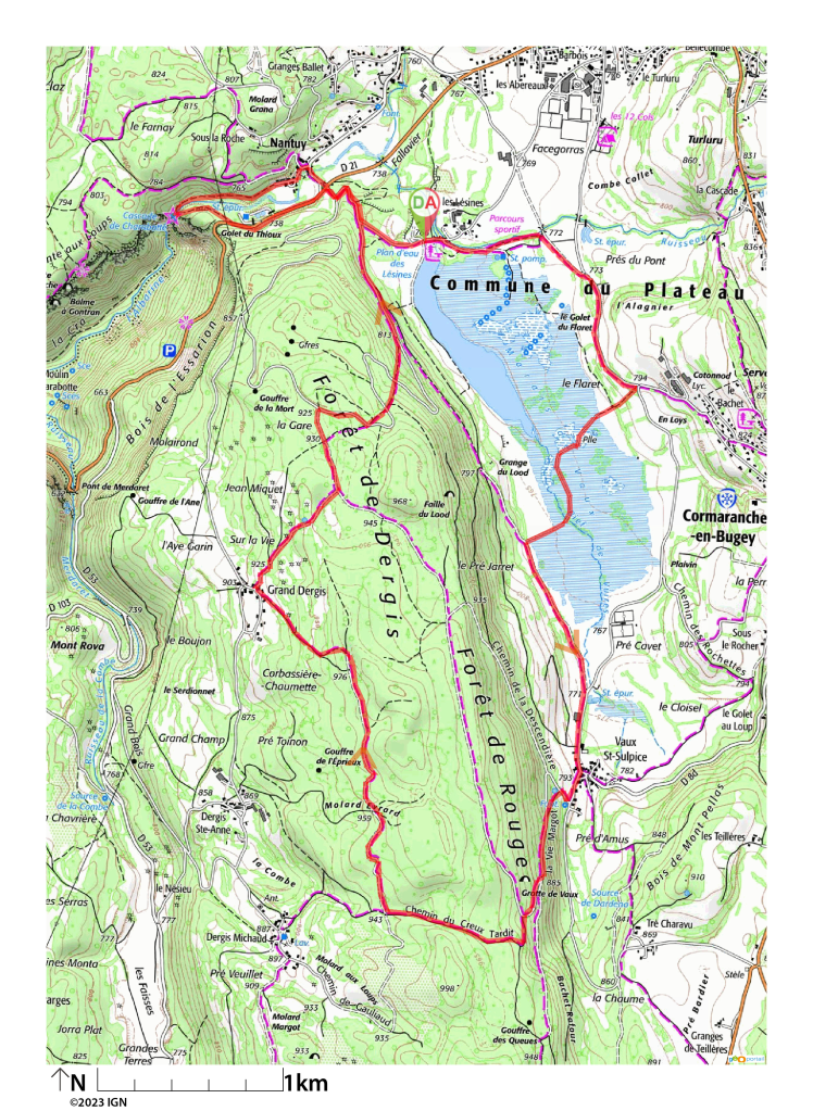 Pour cette rando belle journée ensoleillée nous étions 7 dames et 2 hommes . Aprés un petit tour sur les pontons au milieu des marais , nous rejoignons Vaux St Sulpice .De la nous attaquons la montées dans la forêt direction le hameau de Grand Dergis Avec l’ombre des arbres et un petit vent cette montée est agréable . Casse croute dans un pré dans l’ombre d’une clairière .Puis descente vers la Cascade de Charabotte . Moment d’hésitation au pont de Nantuy:Pas d’eau dans l’Albarine . Nous allons quand même jusqu’au but . Le haut de la cascade ,alimenté par un petit filet d’eau ,est vraiment impressionnant et le point de vue est trop dangereux pour y accéder .Sous l’indication d’une personne nous revenons par l’autre rive . Nous découvrons ainsi que la cascade est alimentée par la centrale d’épuration d’Hauteville .Pour une sortie de 6 h 15 nous avons parcouru 14,5 km ,fait 395 m de dénivelé ,Tous cela dans la bonne Humeur .