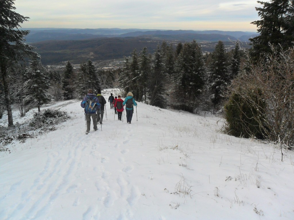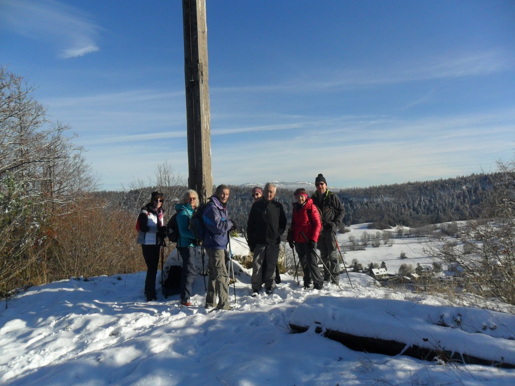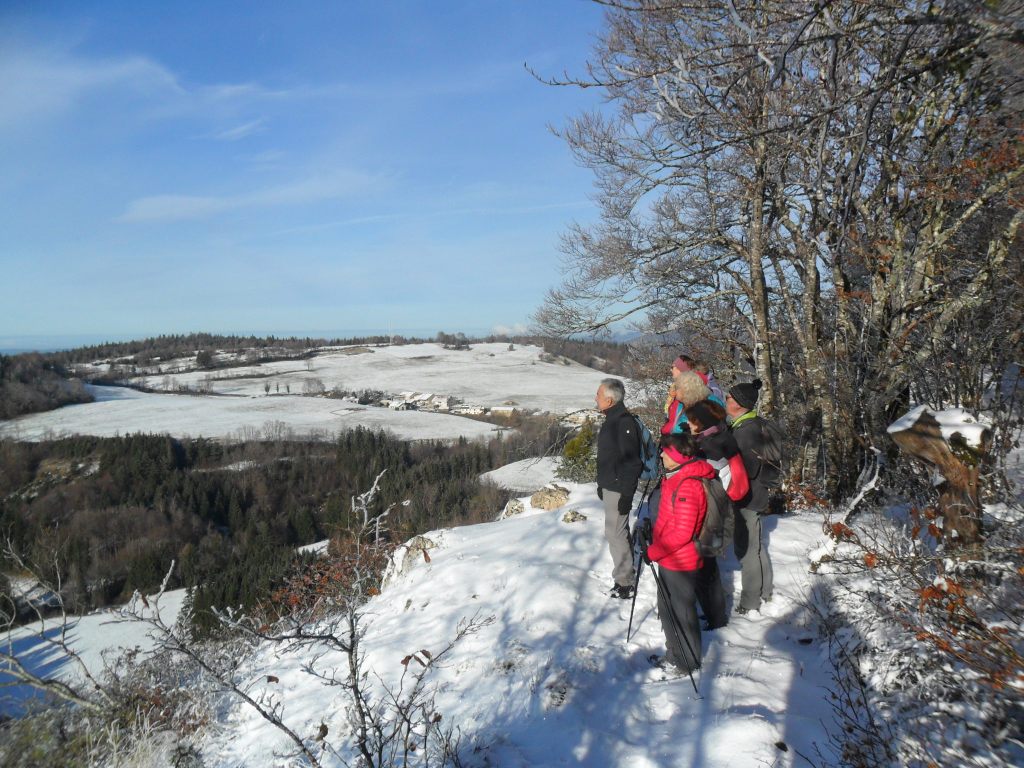 Nous nous sommes retrouvés 8 randonneurs ( 4 dames ,4 messieurs) les pieds dans la neige au départ d’Apremont et sous un beau ciel bleu bien dégagé. Pour raccourcir l’itinéraire nous montons par la route pour prendre le sentier qui nous amène au lieu dit « sur château ».Après un arrêt aux 2 points de vue nous descendons pour rejoindre le chemin qui nous fait remonter sous le mont Jora .Là ,fin du beau ciel bleu avec vue sur les nuage qui nous arrivent depuis la Bresse .Nous rejoignons les voitures en prenant la trace puis le chemin qui nous amène à ‘La Gotette’ pour entamer ensuite la descente sur Apremont . Ce fut une première sortie hivernale bien sympathique