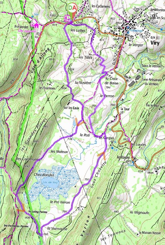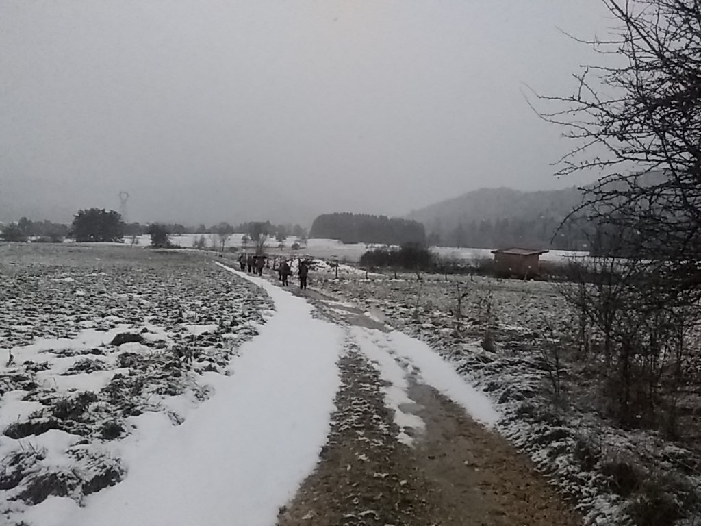 L’éclaircie a eu lieu ce matin au lieu de cet après midi : dommage ! La neige annoncée n’a pas empêché une équipe de 10 SBD (8 & 2) de se retrouver sous la pluie en bas puis sous les flocons sur le plateau de Viry. Très peu de neige au plus 10 cm et souvent rien sur les grands chemins qui mènent au lac de Viry. En moins d’une heure nous voilà au dessus du lac à la ferme Bondet. La neige s’arrête de tomber, il fait presque bon, les nuages sont légèrement remontés, l’allure est soutenue aussi au lieu de rentrer, nous faisons le tour du lac avec retour par la petite route puis après avoir traversé le petit pont vers « le Roti » nous voilà à travers champs et petits bois pour revenir après 2 montées de 50 m, une dizaine de passages de clôtures au lotissement des Lattes. Tout le monde a trouvé que l’on avait bien marché et après calcul de l’itinéraire suivi ce sont 9,3 km et 120 m de dénivelé que notre petit groupe a avalé cet après-midi ! Bravo à tous et merci à Michelle pour ses conseils sur l’itinéraire. Daniel