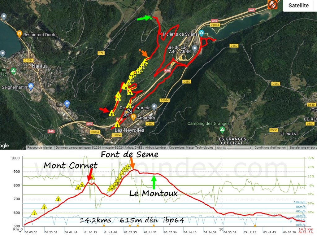Nous sommes donc partis des Neyrolles (510 m), pour emprunter un large chemin montant en pente douce jusqu’au départ du sentier du mont Cornet.(837 m} .'( Aller -retour.) Au sommet , belvédère sur les Neyrolles.