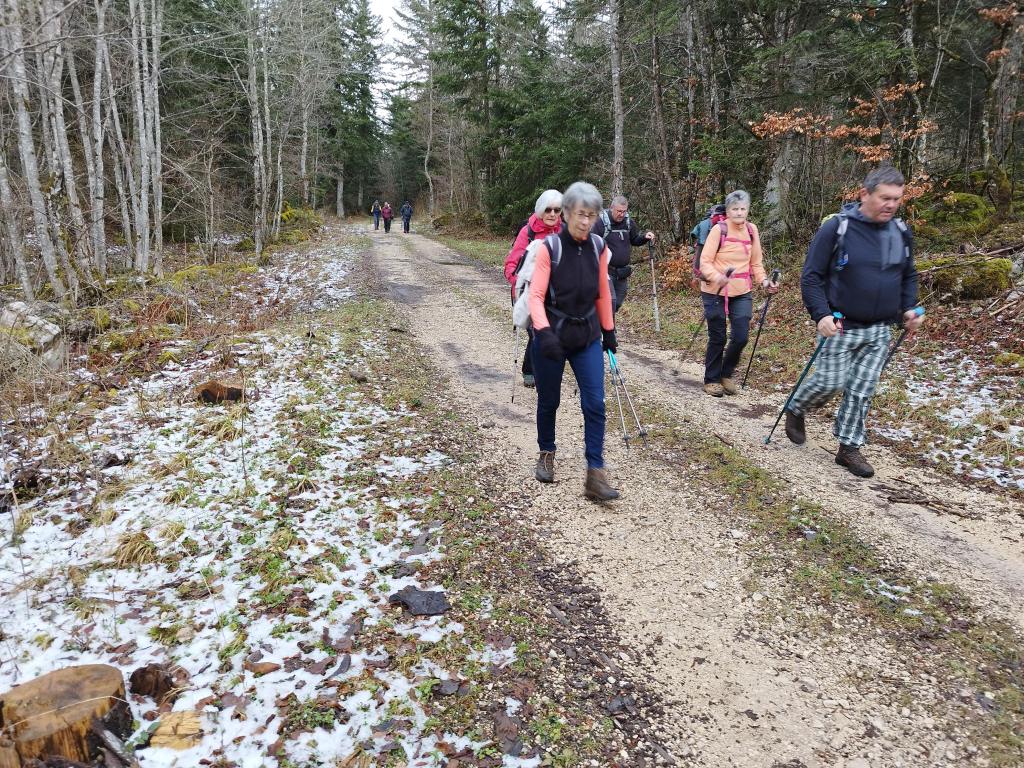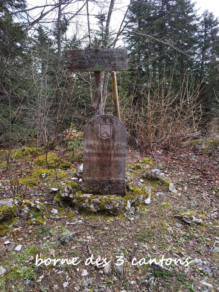 Et c’est parti pour un court échauffement avant d’attaquer une première montée, parfois raide… 350m dén, jusqu’à Montfalcon. Une longue piste ( accessoirement de fond) nous mène aux Platières, puis la borne des 3 Cantons…. Un peu de neige fraiche jalonne la trace.. le ciel est bien couvert et l’atmosphère rafraichissante…