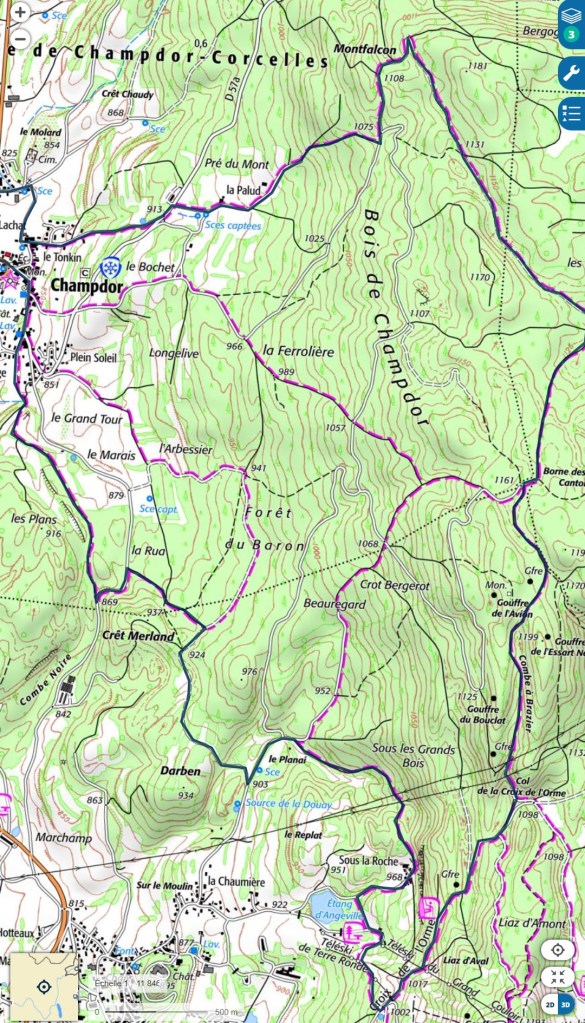 Une courte visite au parc aventure, un tour de l’étang, la découverte du hameau Sous La Roche, une succession de pistes, chemins, petites routes nous ramène au village, 6h30 après notre départ.