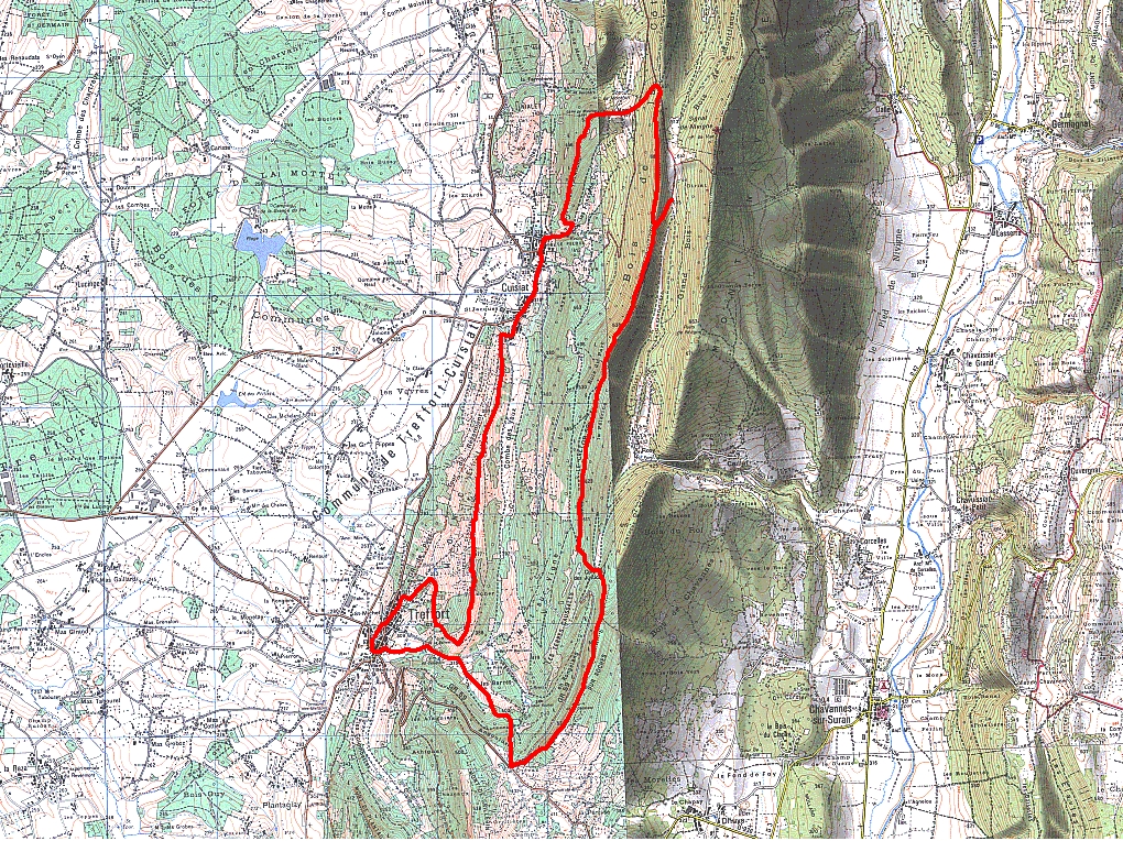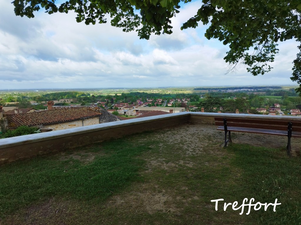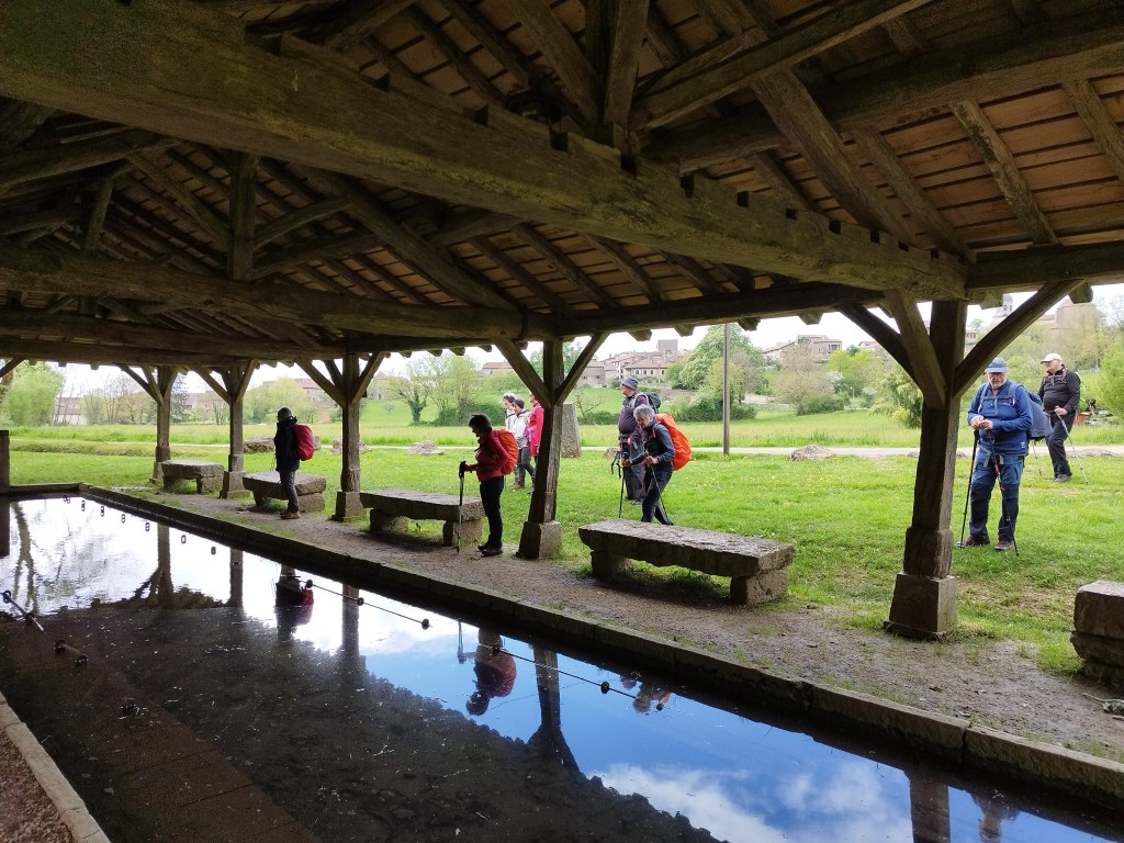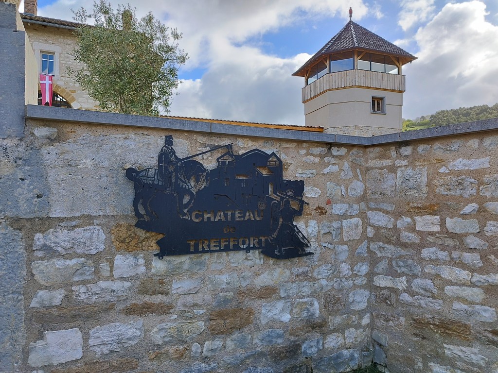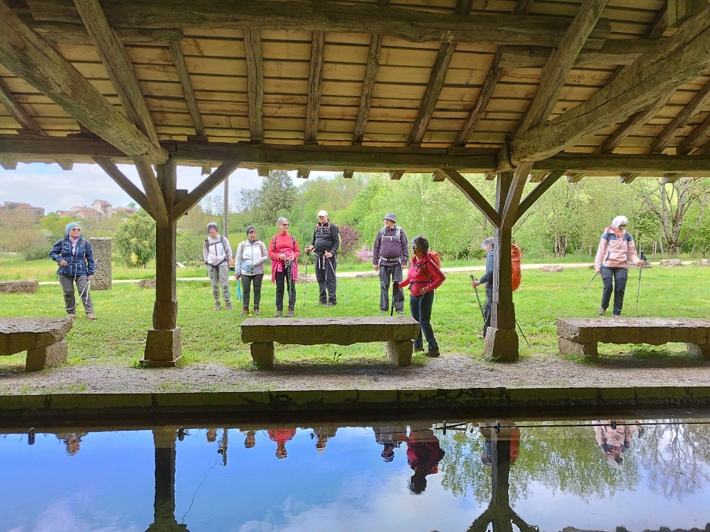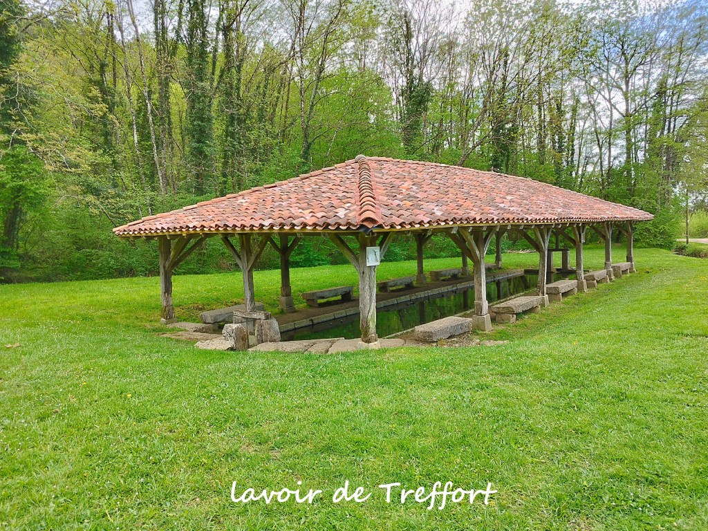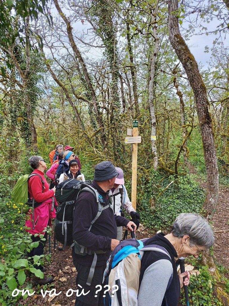 Nous voilà sur le GR59… sentier sur des pierres glissantes et encombré de genets, ronces. Au premier carrefour, interrogation ? un marquage étrange (apparemment récent) nous indique des directions improbables…. voire impossibles surtout sur un GR ! Pas de panique, on trouve un lieu accueillant pour la pause et on repart sur la bonne voie ! On débouche au col des Justices, marquant le début de la crête de Cabatane. De beaux points de vue sur la Bresse avant d’atteindre la Croix des Angoulures. Une large piste nous ramène à Treffort non sans admirer le magnifique lavoir.