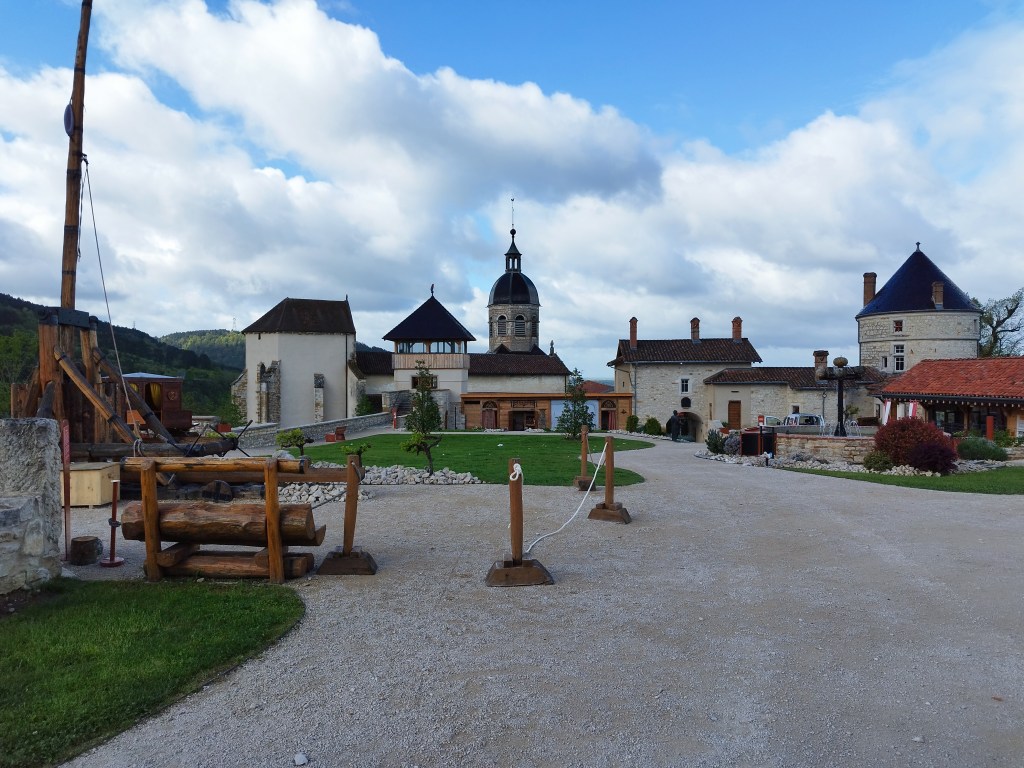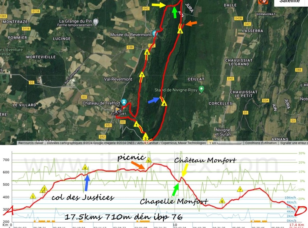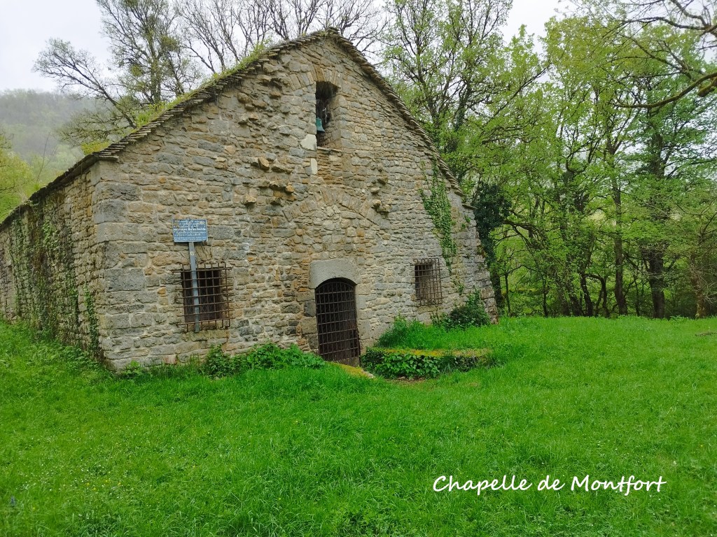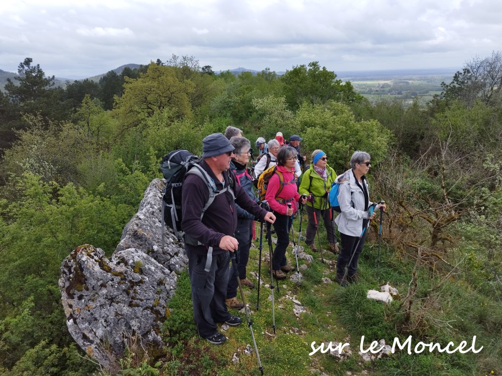 Fins prêts à 9h30… découverte partielle du château ( très beau en l’occurrence) et on entame la longue boucle. Tiens … et cà n’était pas prévu !!! on peut grimper sur le Moncel… et le Chapeau de Gendarme.. Une crête fort sympathique avec quelques vues, avant de descendre sur Cuisiat . Nous traversons le village, attaquons la Palanche et gagnons les ruines du Château de Monfort; suit une descente raide pour atteindre la chapelle. On « chope » la radée ! Exercices (répétés) pour Olivier : enfiler la cape de pluie en autonomie; çà demande encore un peu d’entrainement ….