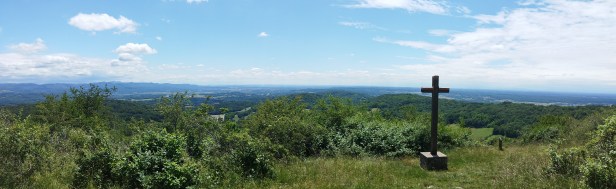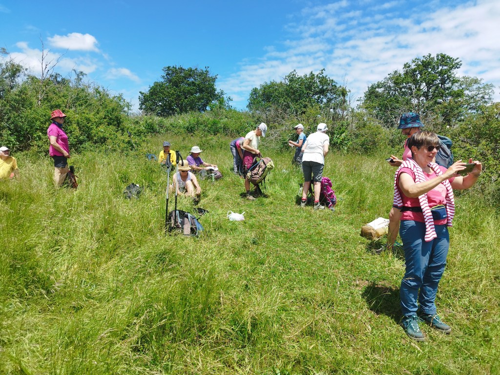 On descend à nouveau jusqu’ au village de Salles. On grimpe à nouveau, remarquons tout un ensemble de murets, ruines ??? passons aux Fontaines, le bois de Pommier, atteignons le GR59. Plein nord jusqu’aux Feuillées Rouges; on descend un peu, et Le Pilon est face à nous …. c’est là haut qu’il faut grimper !! L’arrivée sur ce plateau est surprenante… il est envahi par des buissons peu hospitaliers, des ronces agressives…. et il faut se frayer un chemin sans marques pour gagner ( enfin) la Croix de la Dent.