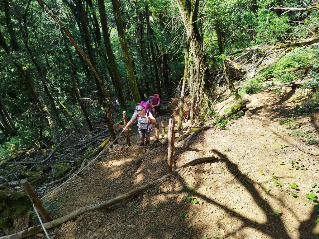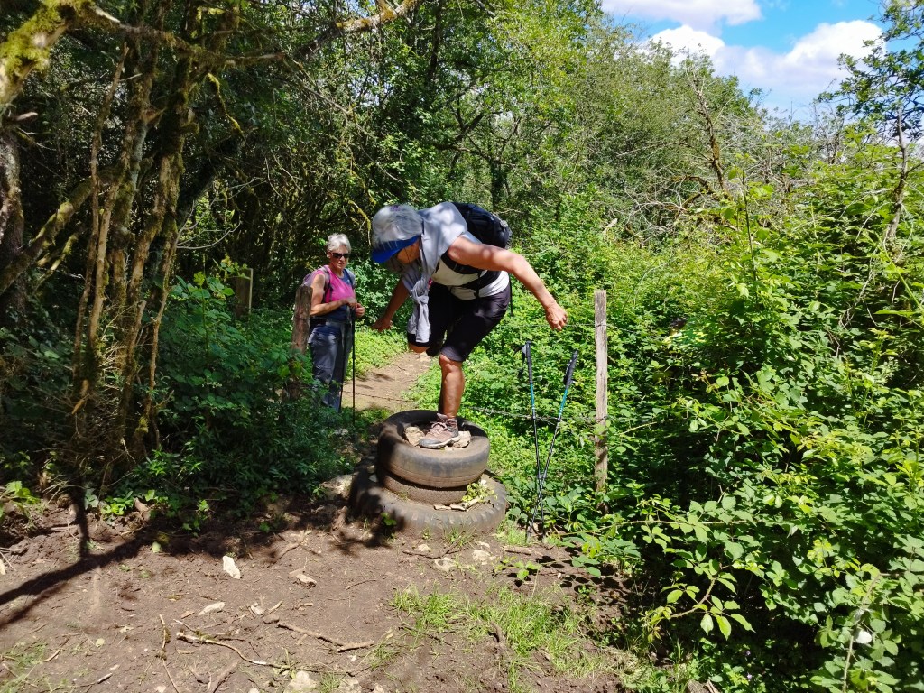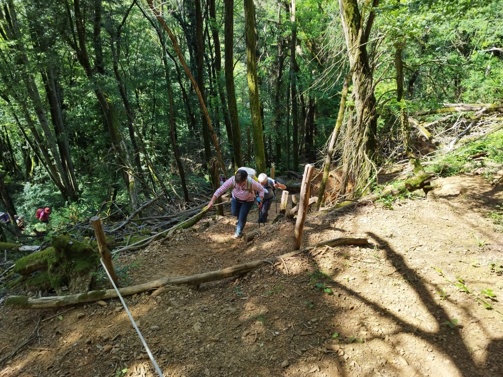 On s’élance… en descente pour arriver au Colombier. Un gros « coup de cul » se présente 85m ( raide) sur 165m de distance; de grosses marches et une corde pour s’accrocher ! Ouf ..