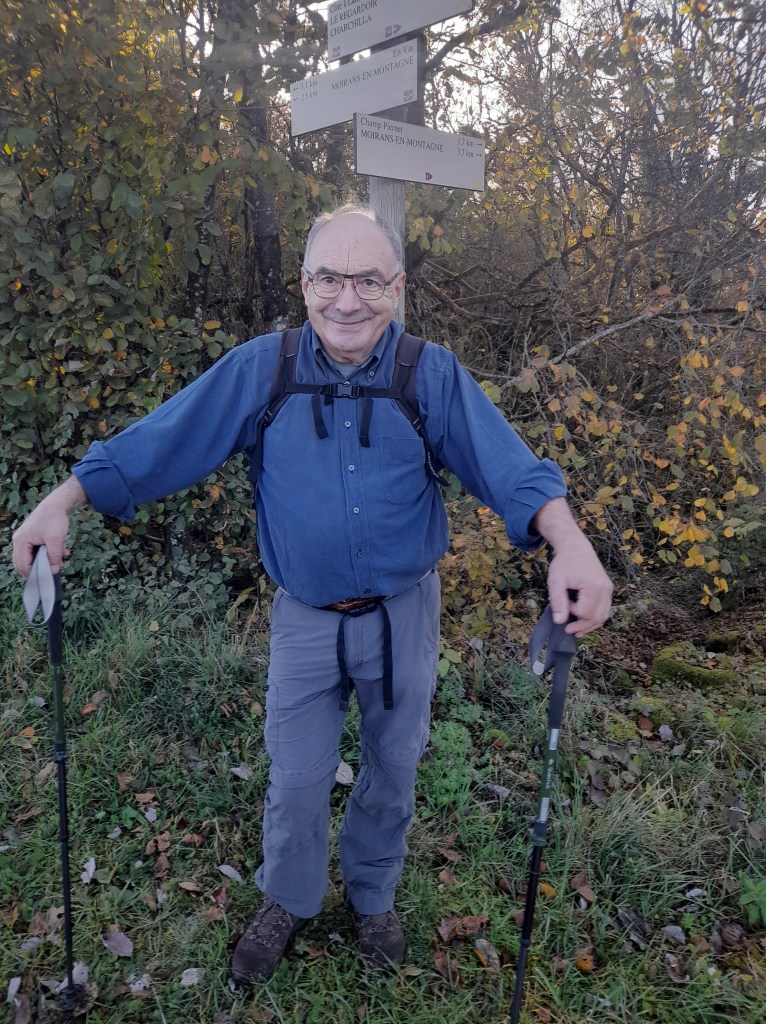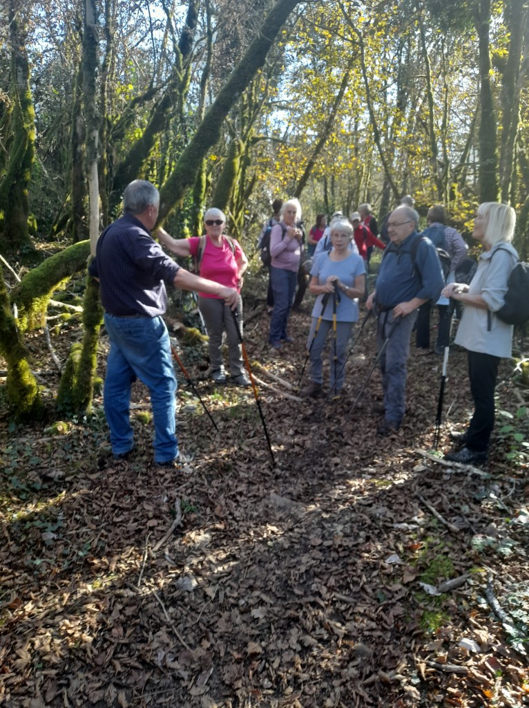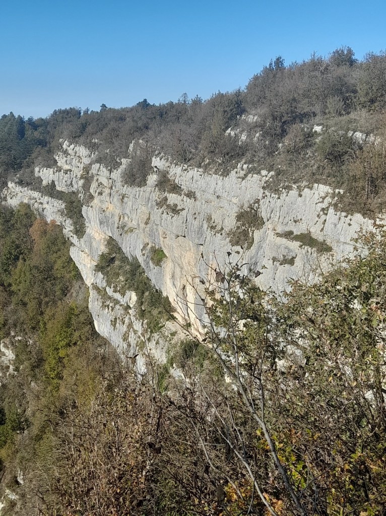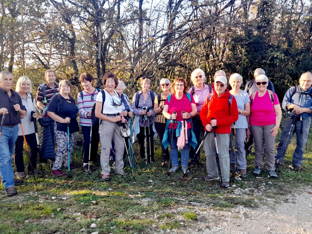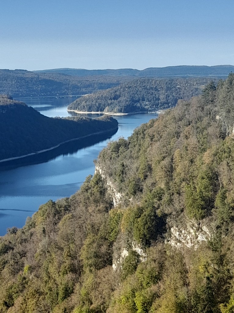 La balade le long de la D 470 bruillante qui est fréquentée par de nombreux camions , débute avec 18 randonneurs dont 6 hommes , mais heureusement beaucoup plus calme dans les bois de la Réfrèche puis le long de la crête avec de beaux points de vue qui dominent le lac de Vouglans .