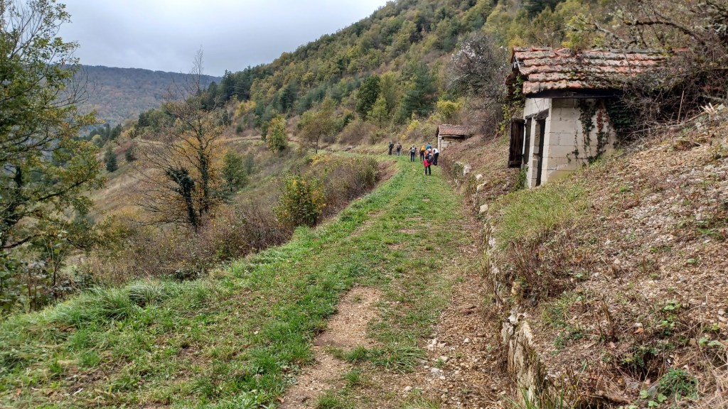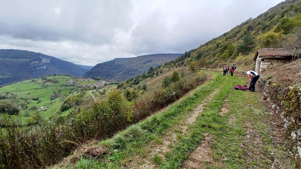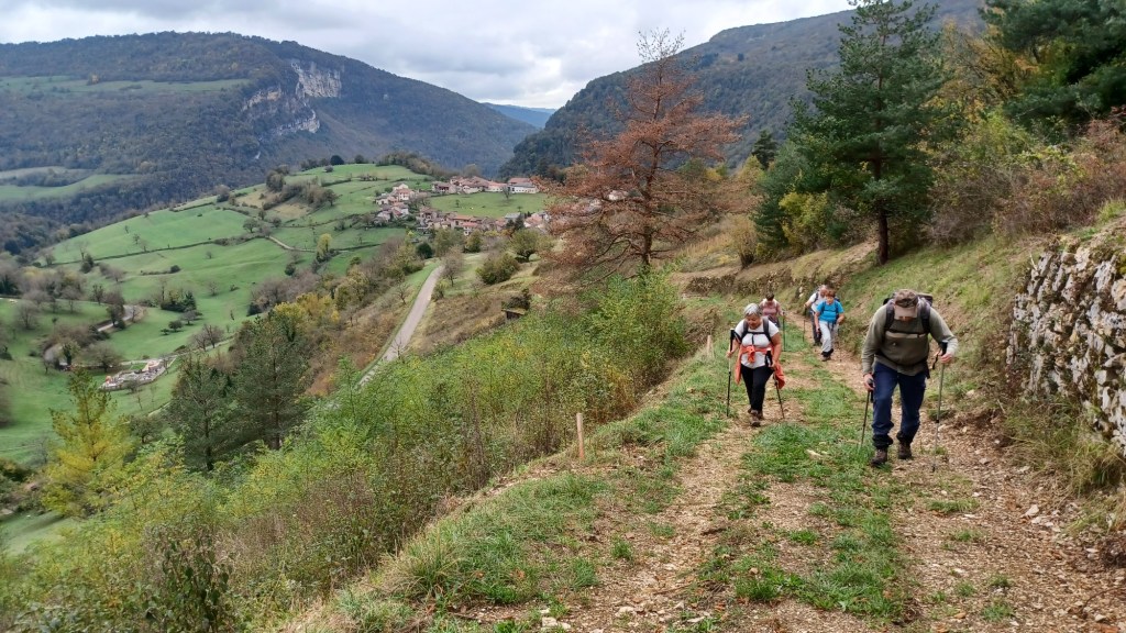 Après tout ce temps je vous amène un peu de lecture. Pour cette sortie à Oncieux (le village rond) nous sommes partis de Dortan sous une pluie battante. Notre confiance illimitée dans les sites météo a payé puisque la pluie à cessé à l’arrivée à Evosges et la journée à été très correcte. Nous étions 14 courageux dont 10 courageuses. Nous sommes partis du col d’Evosges en direction de Montgriffon par des sentiers en pentes douces et descendantes. Nous avons fait l’étape casse-croûte dans le village de Moment et retour en passant par Oncieux et remontée finale assez raide qui se termine par un très belle vue sur la vallée de l’Albarine. Au bout du compte 16 kms au compteur pour 657 mètres de dénivelé dont 300 dans le dernier km.