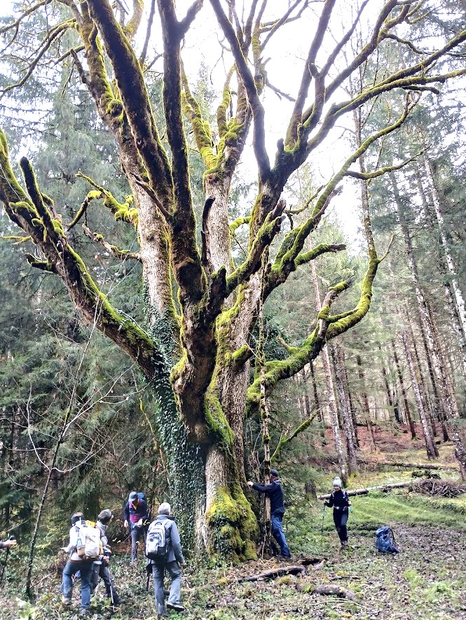 Puis par un chemin agréable, nous rejoignons le chemin de crête. De là nous rejoignons cet arbre remarquable ,perdu au milieu des bois…et pourtant avec un tronc imposant que chacun a tenté de mesurer avec les moyens du bord…(4m20 de circonference)..Et c est Annie qui a gagné !!Puis nous remontons avec autant d énergie qu à la descente. Pour rejoindre les fournets, la petite coinche, la coinche, et retour par la GTJ. Pour finir par le chemin des trappeurs qui nous mènera aux voitures.