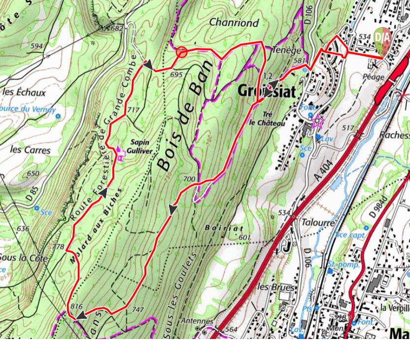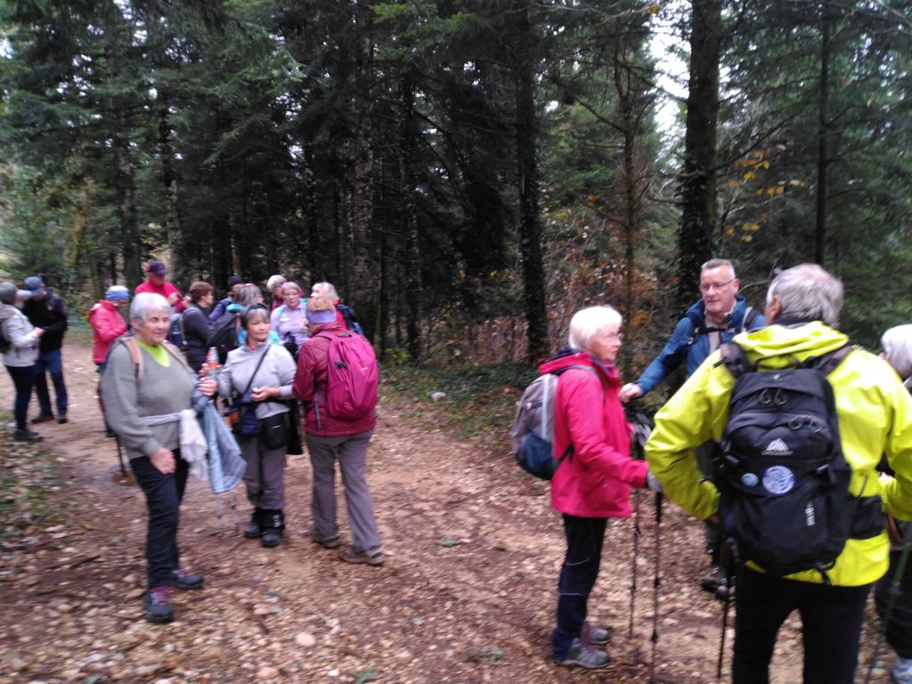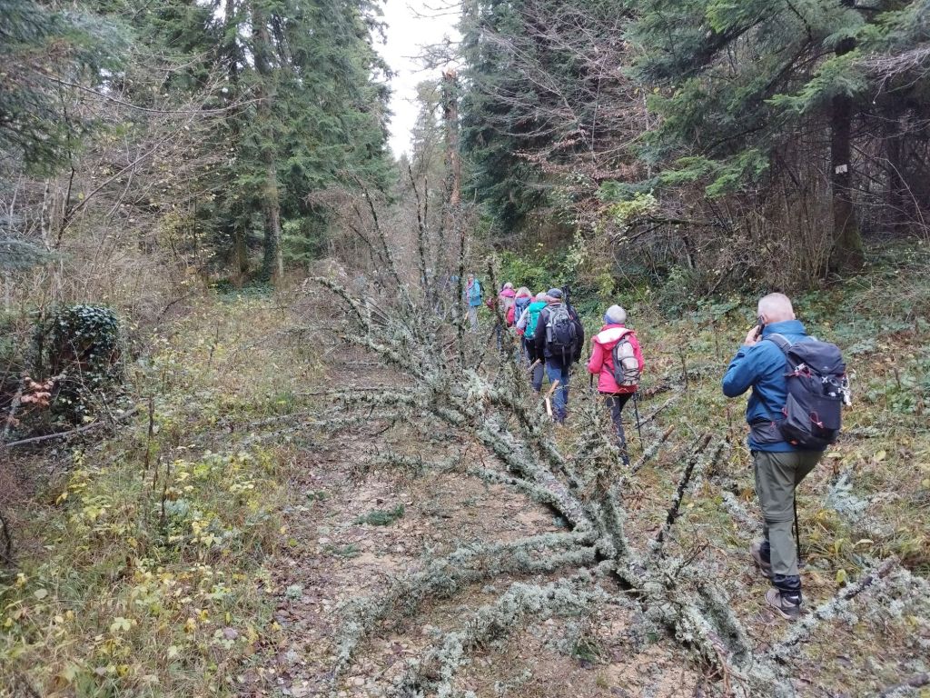 Pas de neige mais pas de pluie non plus pendant cette boucle autour du Bois de Ban. 21 participants : 15 randonneuses et 6 randonneurs pour une montée par paliers jusqu’au point de vue des Grands Plans : vue sur Martignat d’un côté sur Izernore et Matafelon-Granges de l’autre. Après 280 m de dénivelée sur un grand chemin forestier petite pose pour gouter aux friandises et boire un coup. Ensuite c’est le retour toujours par un grand chemin avec de temps en temps un ou plusieurs obstacles en travers. Passage près du « sapin Gulliver » niché au fond d’une combe et descente sur Groissiat pour rejoindre le parking. 7,5 km et 310 m de dénivelée positive totale d’après les GPS interrogés. Un bon bol d’air frais pour tous en cette après-midi du 3ème jour de l’hiver météorologique. A bientôt. Daniel