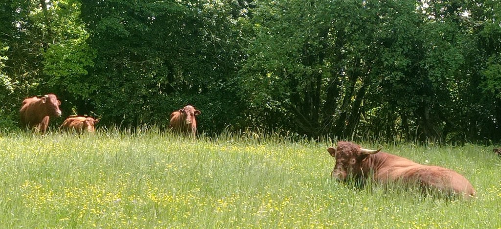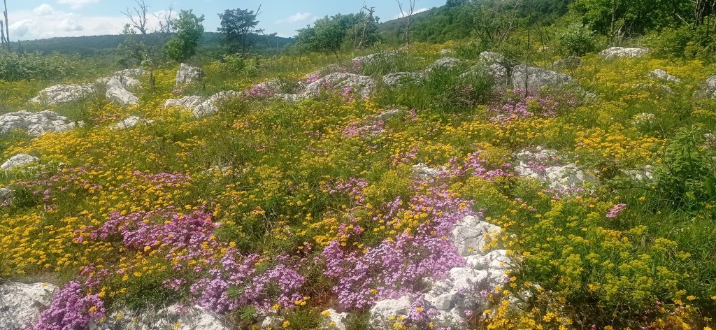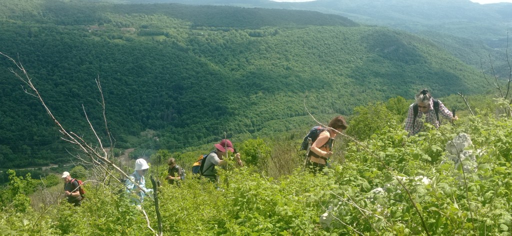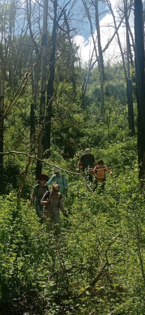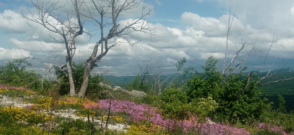 A l’heure où j’écris, l’orage est sur Dortan … et je me rends compte de la chance que nous avons eu hier de vivre cette aventure insolite sur la bordure de la zone de l’incendie de 2022, hors des sentiers mais sur un tapis de fleurs multicolores, sous un ciel souvent bleu mais spectateurs des orages qui tonnaient au loin et peu nombreux (seulement 7 randonneurs dont 3 hommes), mais très motivés par les paysages proches et lointains …. Au bout du compte, on n’aura marché que sur 6 km et 200 m de dénivelé, mais le parcours était plus difficile que prévu : la végétation a beaucoup poussé depuis mon passage à l’automne dernier, une variante pour garder au maximum un superbe passage en crête qui se terminait par une pente raide et bien encombrée est à éviter et les clôtures sont souvent délicates à franchir …..