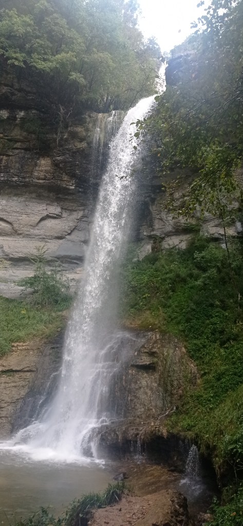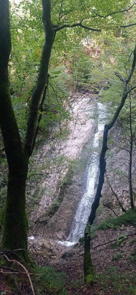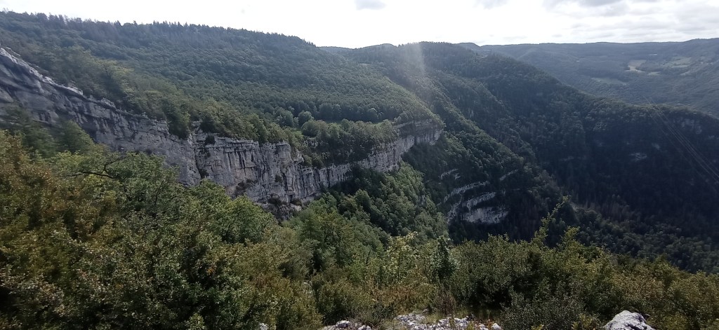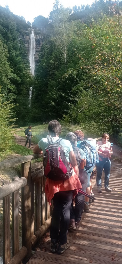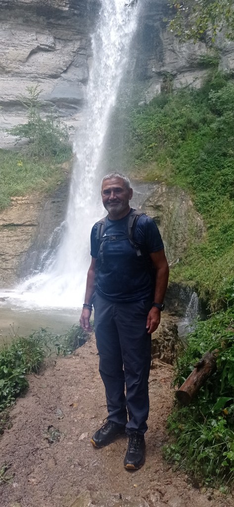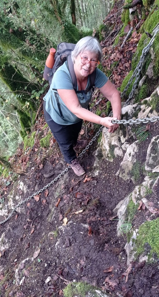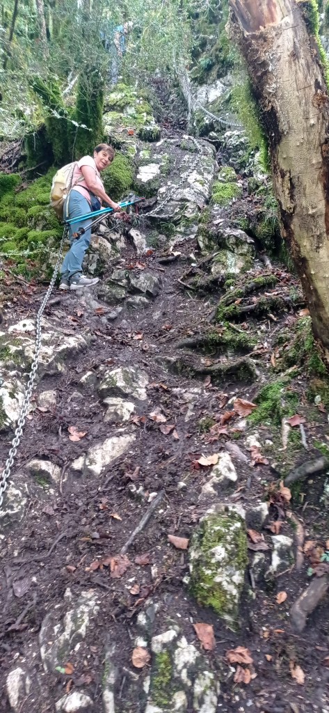 Au départ du parking de Rochefort, on va vite en vue de la cascade de la Queue de Cheval: le spectacle est admirable car les pluies de la nuit ont bien mouillé la région: on décide de faire « le supplément Queue de Cheval » pour admirer la cascade au plus proche. On continue par les gorges sauvages du Tapon et le petit chemin est parfois bien raide…. Après une traversée facile, on arrive à midi au pied de la partie la plus difficile de la randonnée: une montée sur 250 m très raide sur un étroit chemin terreux avec , vers la fin, un passage chainé beaucoup plus humide que souhaité pour franchir une barre rocheuse… Je n’ai même pas eu à sortir la corde et, soulagés et contents d’avoir réussi, nous avons tous bien apprécié un déjeuner tardif et calme dans un bel endroit… La suite ne posait aucun problème à part la fatigue de la longue descente par le chemin des Moines; au total, on aura fait 15 km et 850 de montée.