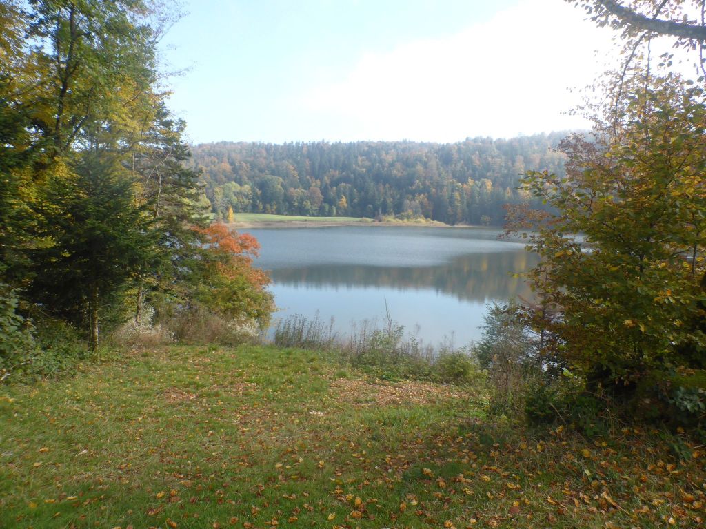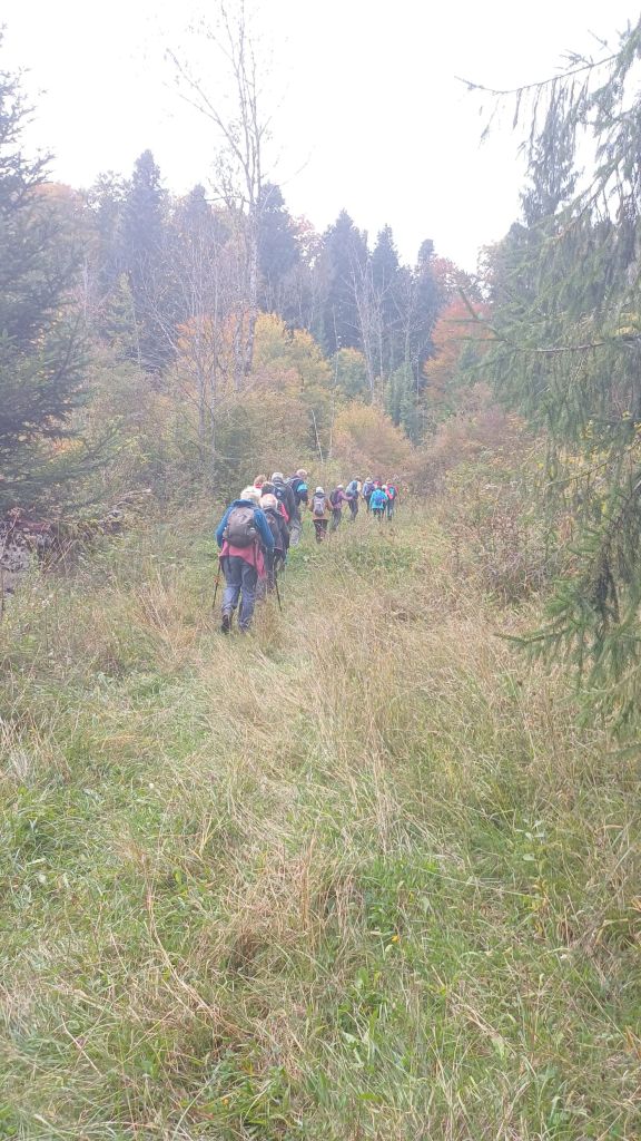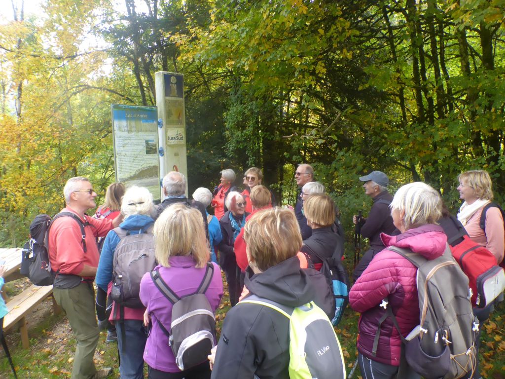 Les stratus permettaient de voir le soleil depuis le stade mais celui-ci a joué à cache-cache tout l’après midi. 6 voitures ont été nécessaires pour transporter tous les participants jusqu’au parking du site gallo-romain au dessus du village. 21 Dames pour 5 messieurs. De belles couleurs d’automne et un chemin sympa pour monter jusqu’au lac. Découverte du lac d’Antre sous le soleil et lecture du panneau avant de passer sur l’ouvrage barrage qui régule l’eau rejoignant le déversoir. Le sentier est beaucoup plus étroit avec quelques branches et troncs en travers pour aller de l’autre coté vers la ferme, face au belvédère d’Antre. (Accès toujours fermé pour aller au sommet)