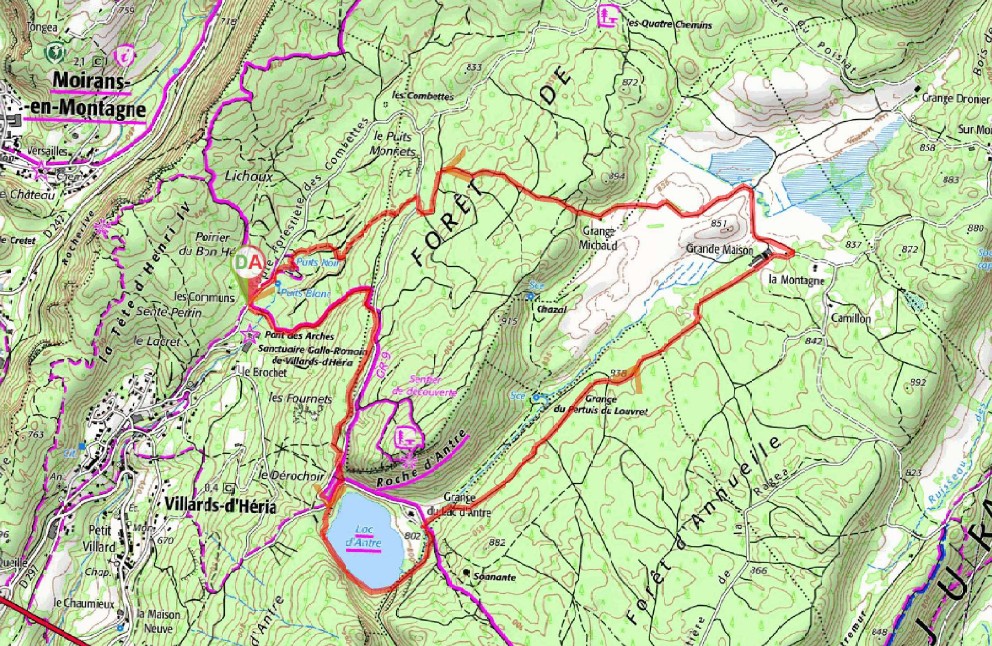 Nous voilà partis plein Nord pour passer à la grosse ferme de Grande Maison. Ensuite c’est le chemin du retour avec la traversée de cette belle combe (au soleil) avant d’atteindre après l’arrêt goûter, la Grange Michaud pour une dernière petite côte bien raide. Voilà maintenant la descente et quelques virages pour aller d’abord au Trou Noir puis au Trou Blanc, résurgences supérieures en cas de fortes pluies. (voir la photo du panneau) Un peu plus de 9 km et de 230 m de dénivelée.