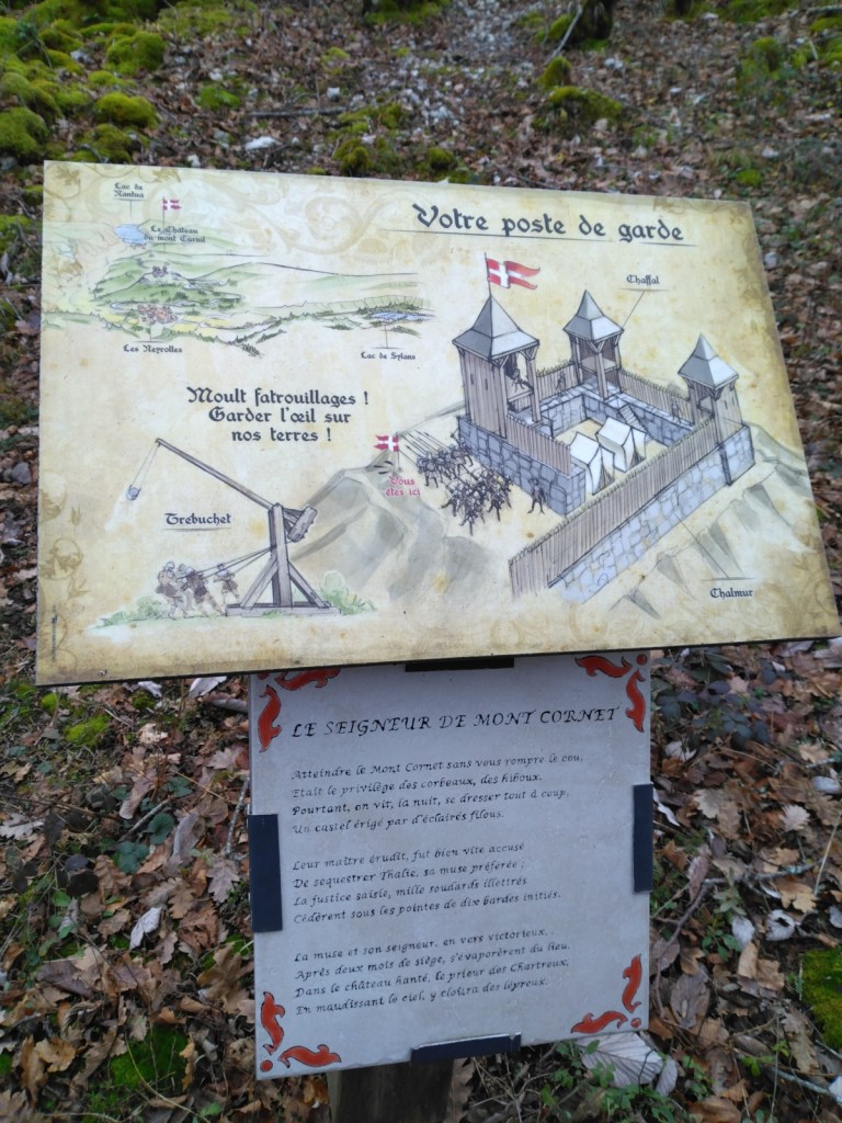 Montée tranquille par les grands chemins en prenant le temps de lire les panneaux jusqu’au sommet. Petits crochets par les différents belvédères de chaque coté du sommet où l’on devine des murs, des fossés une plateforme où se dressait une tour de guet en bois.