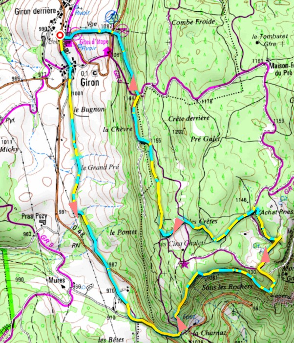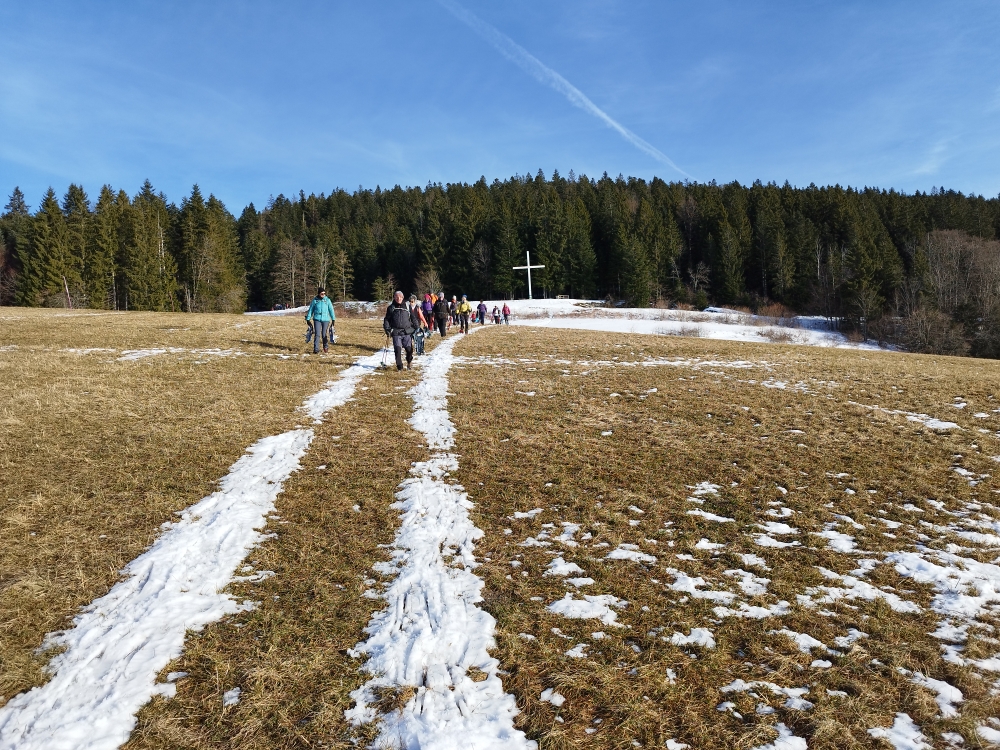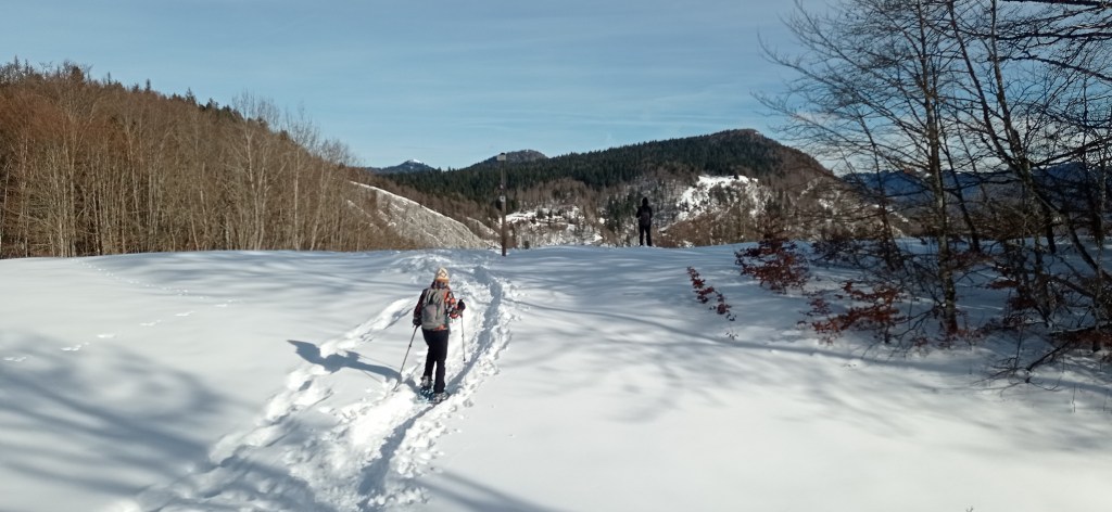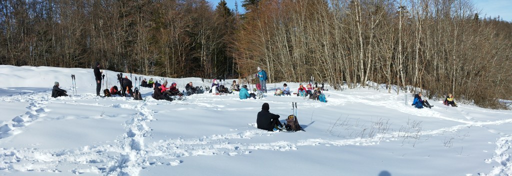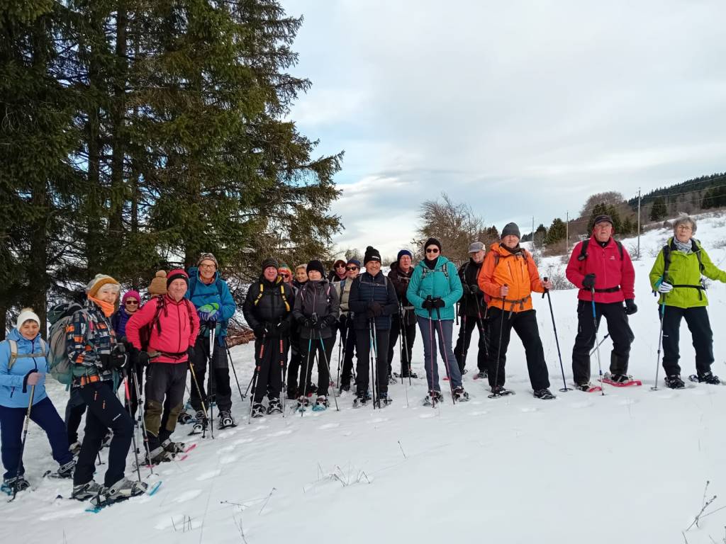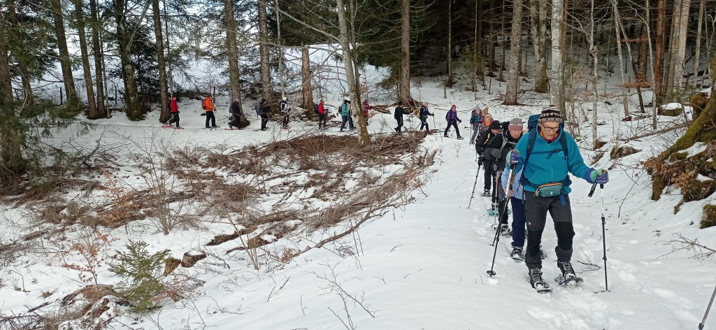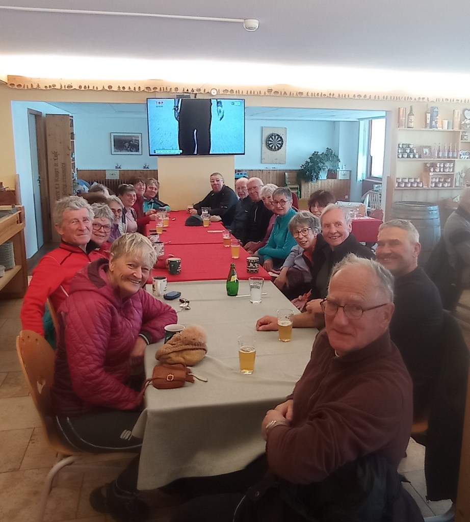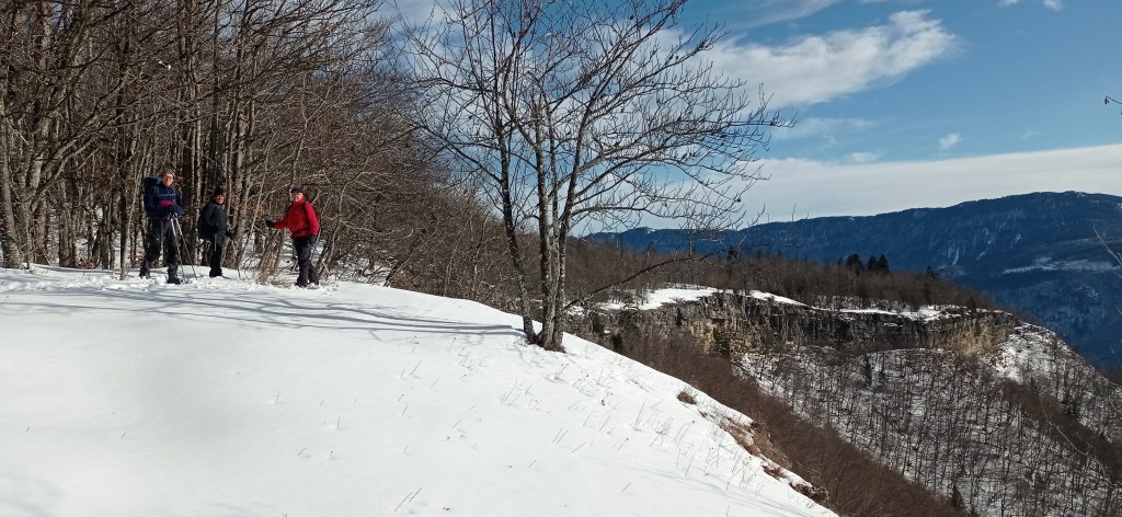 Nous étions 22 randonneurs (dont 9 hommes) bien convaincus qu’il fallait profiter de la neige ce jour là car celle ci a tendance à fondre rapidement vue la température… Sur un circuit d’un peu plus de 9 km et 330 m de montée, nous aurons tout connu: la beauté de la plaine de Giron et le vent de sud en pleine face, la belle traversée au dessus de la falaise qui domine La Charnaz et sa vue magnifique sur les alpes du sud, le déjeuner à l’Achat et son panorama sur toute la crête du Jura, une traversée hasardeuse et une descente technique pour retrouver l’itinéraire prévu (pardon à ceux qui n’ont pas aimé cette aventure !), une belle descente au soleil sur les 5 chalets et une joyeuse pagaille, une dure descente en herbe sur le village de Giron (le matin même, elle était encore enneigée !) et le réconfort d’un pot au Relai des skieurs….