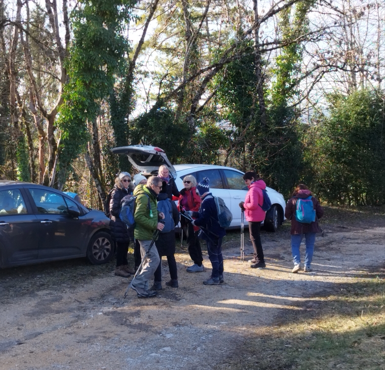 Quelques obstacles obligent à des contorsions et franchissements pour gagner le chemin des coupes, puis la route, que nous remontons avec, au passage, la belle vue sur les Monts Jura encore enneigés.