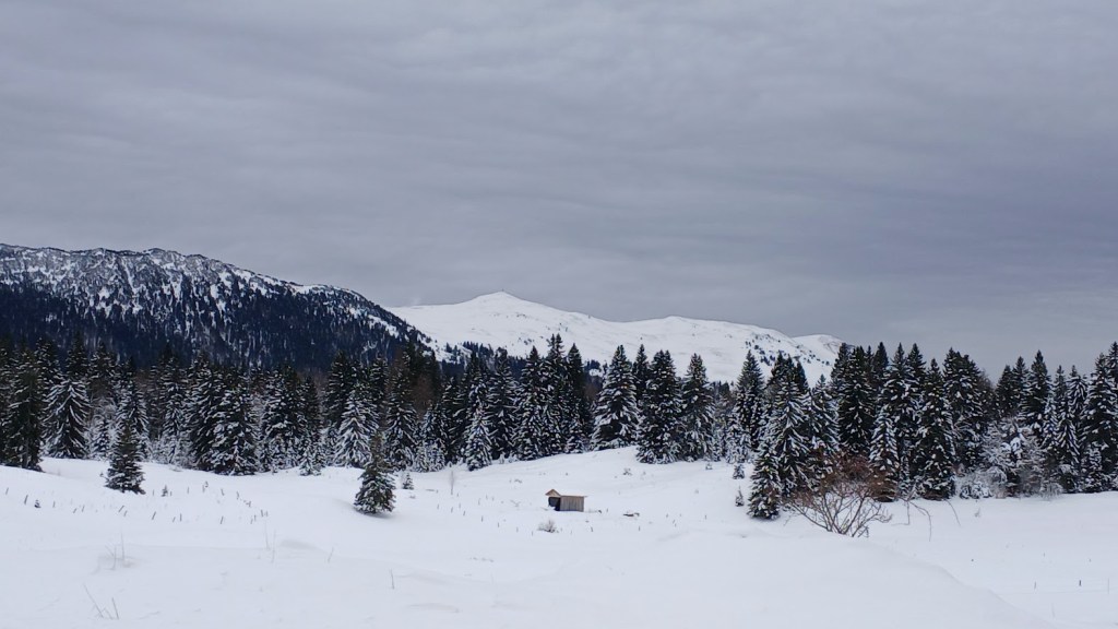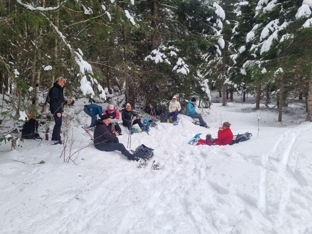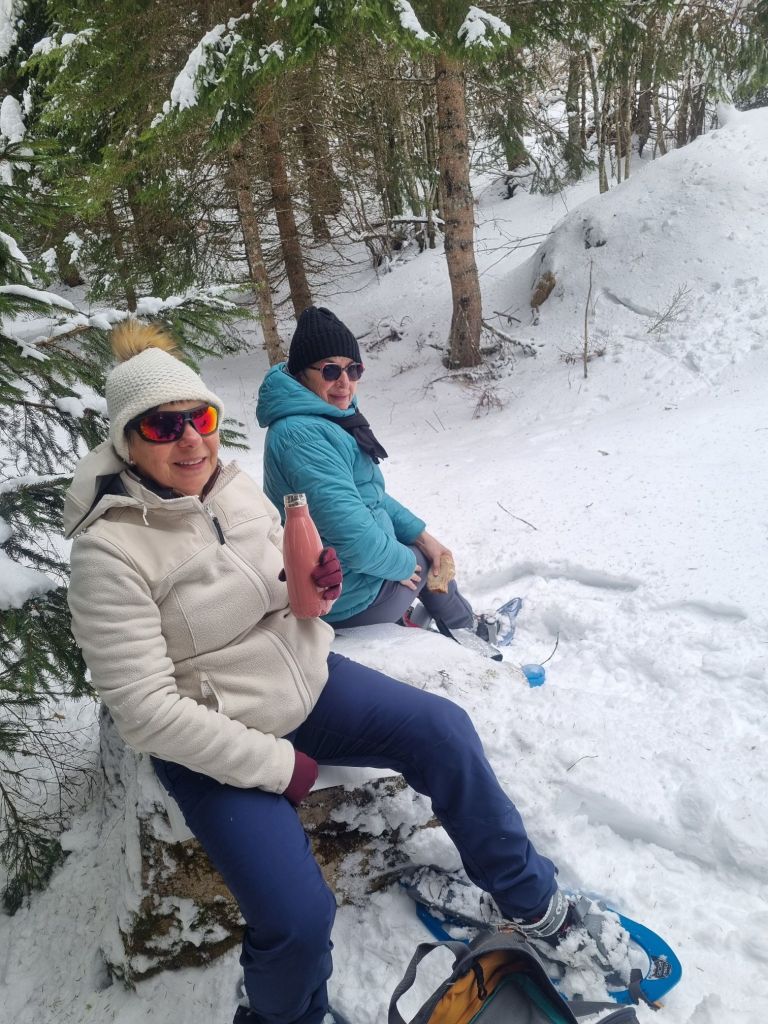 On a pu prendre le temps de casser la croute à l’abri du vent dans la forêt et après, La température remontant, la neige est devenue collante alors on est rentrés directement aux voitures… et on a bien fait la pluie est arrivée juste quand on partait ! On a quand même fait environ 7 km et 200m de dénivelé et rencontré quelques skieurs ou raquetteurs mais pas la foule.