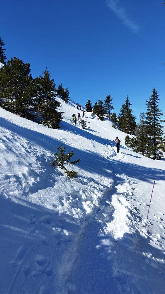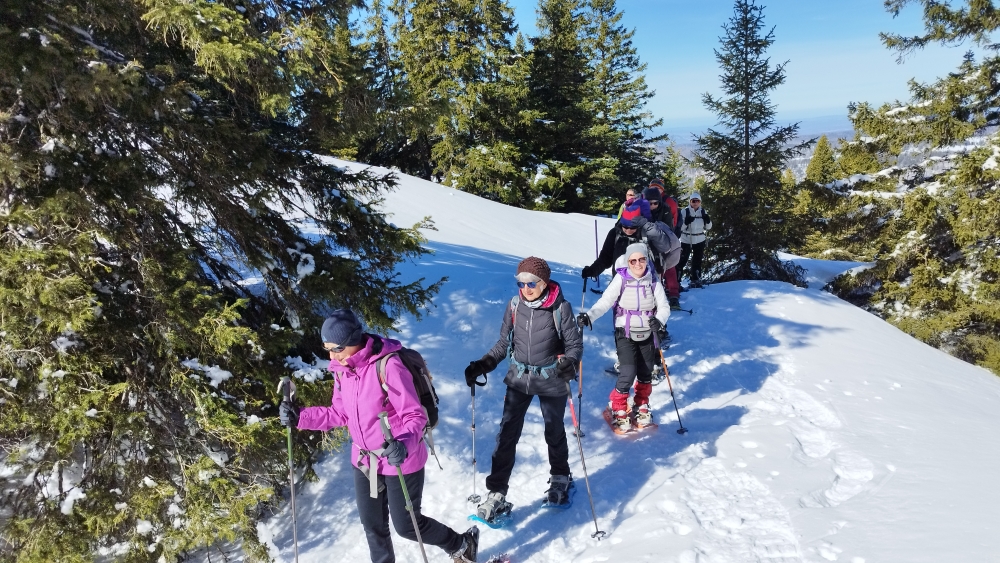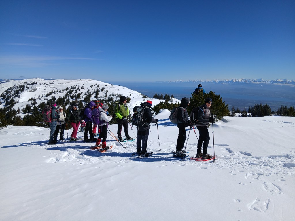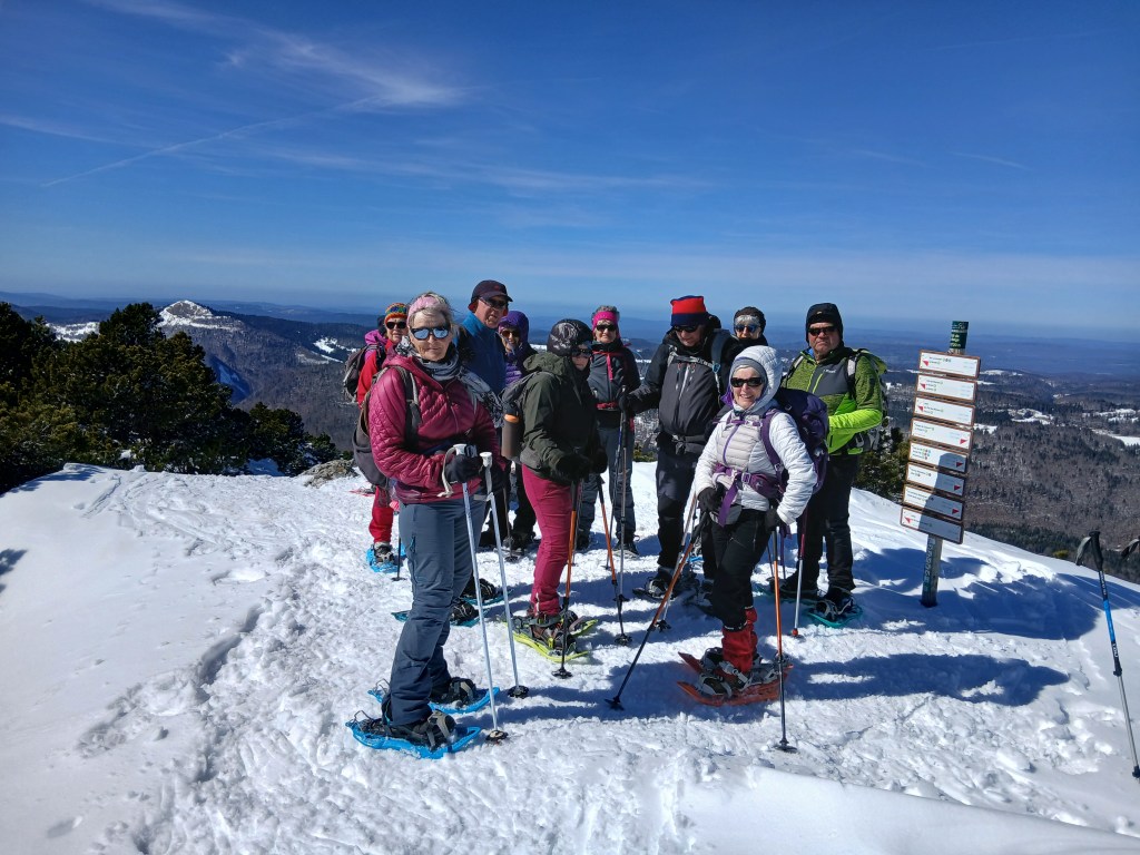 Pour cette belle journée ensoleillée, nous étions 13 participant(es) dont 4 messieurs et nous sommes montés au Crêt de la Neige. Il y avait une couche de belle neige de 1,20 m d’après les mesures de la station. La neige était encore légère et très agréable à pratiquer ce qui est rare en cette fin d’hiver. Nous avons parcouru 6,8 kms pour 330 m de dénivellé et nous avons pu profiter de vues sur les Alpes et sur le massif du Jura assez époustouflantes. Une très belle journée dans la joie et la bonne humeur pour cette bande de jeunes.