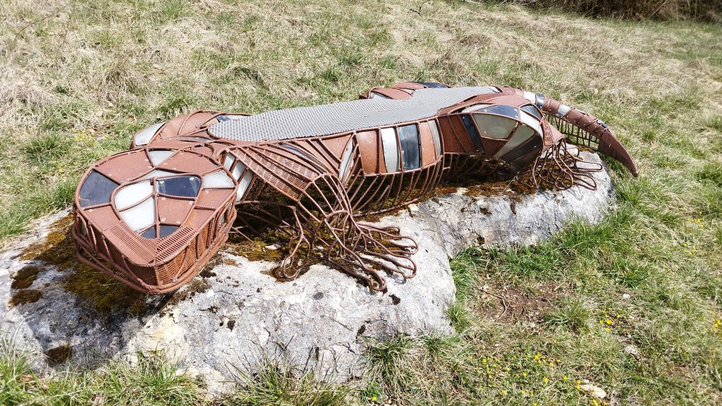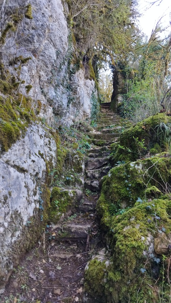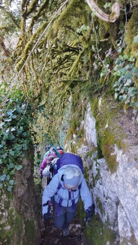 Il fait déjà bien frais!! mais nous allons vite nous réchauffer, car nous attaquons directement sous la falaise que nous franchissons par le bel escalier encaissé. Un passage par le belvédère du barrage, puis un petit détour pour découvrir le « lappiaz » au lieu dit Les Sagoureilles.